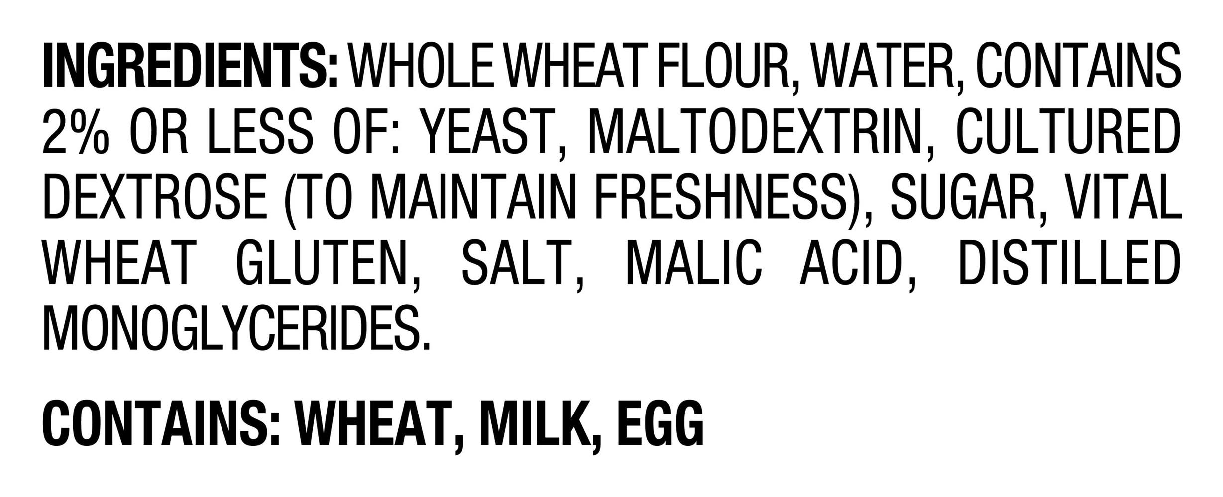 Whole Wheat Flour, Water, Yeast, Contains 2% Or Less Of: Vital Wheat Gluten, Sugar, Salt, Malic Acid, Distilled Monoglycerides, Maltodextrin, Culture Dextrose, And Calcium Propionate And Sorbic Acid (To Preserve Freshness). Contains: Wheat, Milk, Egg Contains: Contains: Wheat, Milk, Egg Additives: None