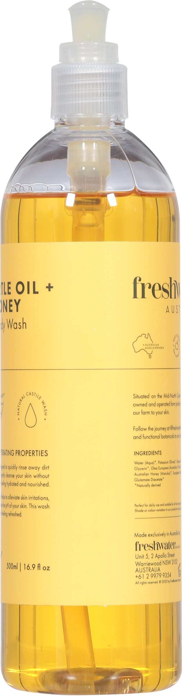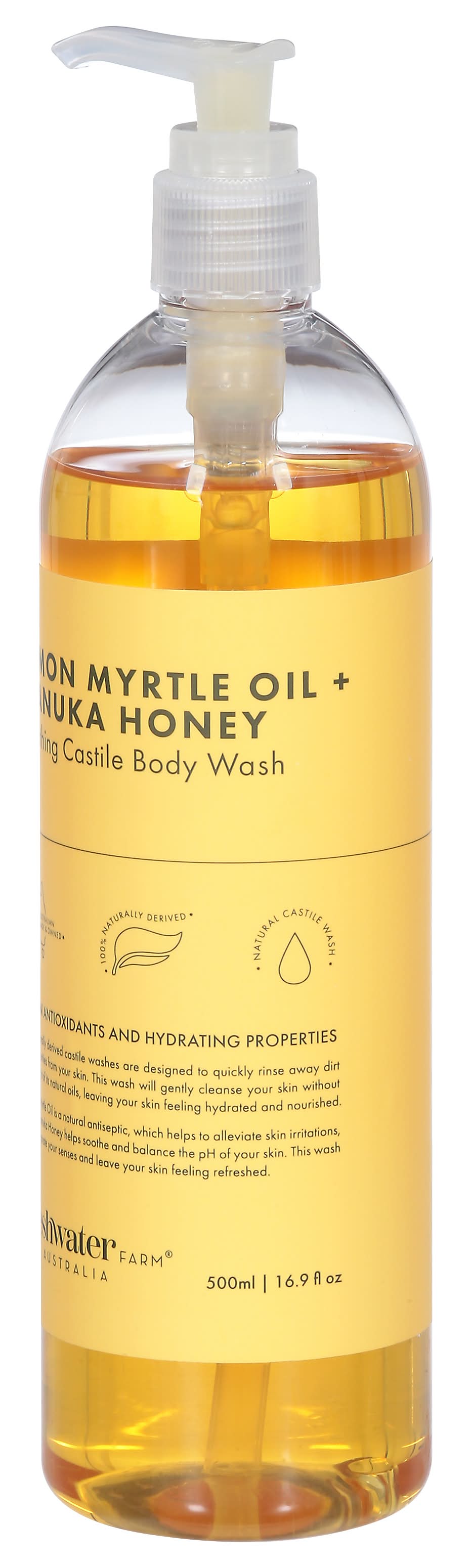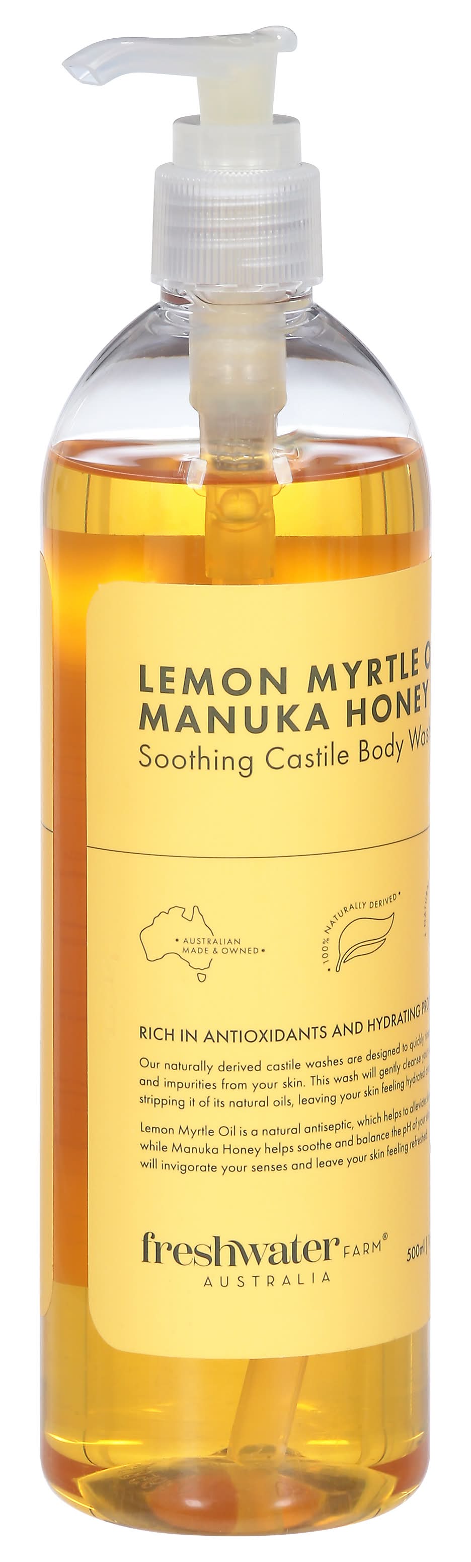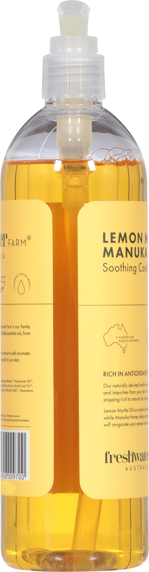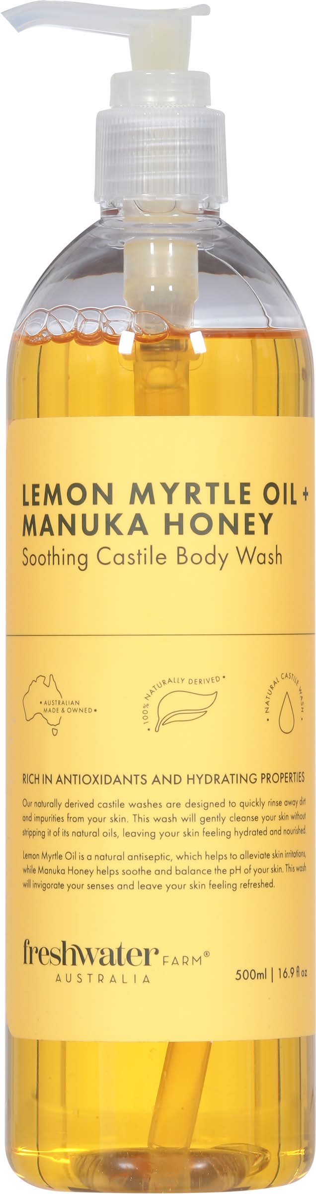 100% naturally derived. Natural castile wash. Rich in Antioxidants and Hydrating Properties: Our naturally derived castile washes are designed to quickly rinse away dirt and impurities from your skin. This wash will gently cleanse your skin without stripping it of its natural oils, leaving your skin feeling hydrated and nourished. Lemon Myrtle Oil is a natural antiseptic, which helps to alleviate skin irritations, while Manuka Honey helps soothe and balance the pH of your skin. This wash will invigorate your senses and leave your skin feeling refreshed. Freshwater Farm Australia. Situated on the Mid-North Coast of NSW, Freshwater Farm is our family owned and operated farm producing a variety of distilled essential oils, from our farm to your skin. Follow the journey at (at)freshwaterfarm_aus as we continue to add aromatic and functional botanicals to our plantation for the benefit of your skin. Australian made & owned. Not tested on animals. Made exclusively in Australia. • Freshwater Brands, • Packaging: Reusable