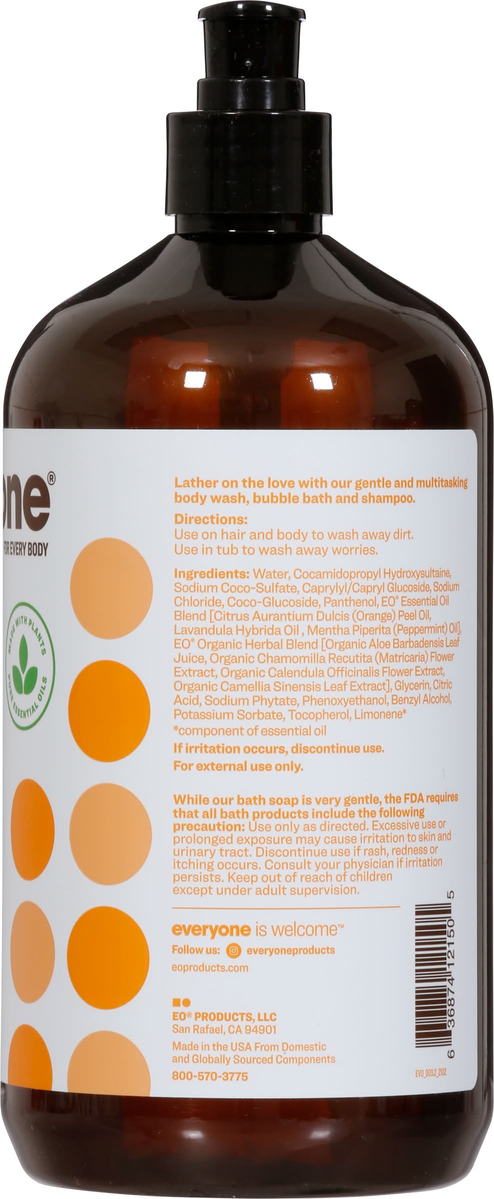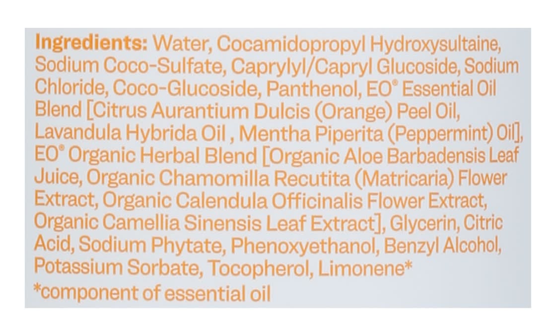 Ingredients: Water, Cocamidopropyl Hydroxysultaine, Sodium Coco-Sulfate, Caprylyl/Capryl Glucoside, Sodium Chloride, Coco-Glucoside, Panthenol, EO Essential Oil Blend [Citrus Aurantium Dulcis Orange Peel Oil, Lavandula Hybrida Oil, Mentha Piperita Peppermint Oil], EO Organic Herbal Blend [Organic Aloe Barbadensis Leaf Juice, Organic Chamomilla Recutita Matricaria Flower Extract, Organic Calendula Officinalis Flower Extract, Organic Camellia Sinensis Leaf Extract], Glycerin, Citric Acid, Sodium Phytate, Phenoxyethanol, Benzyl Alcohol, Potassium Sorbate, Tocopherol, Limonene Component of Essential Oil.