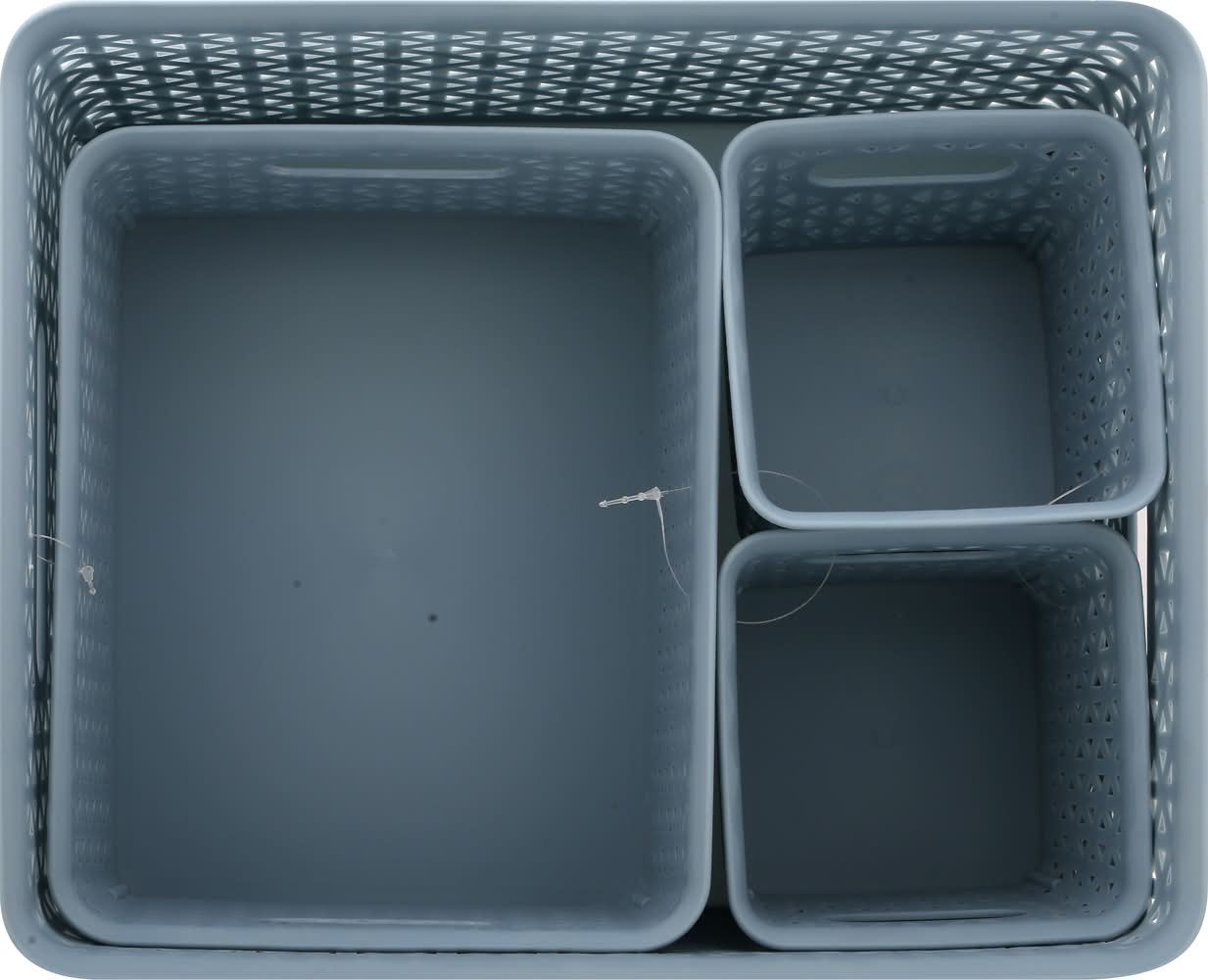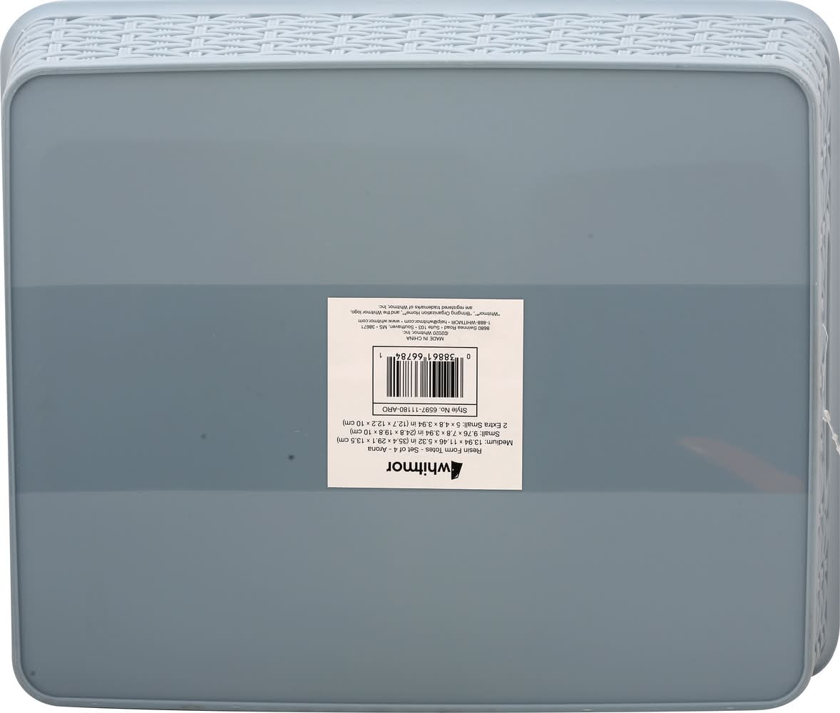 Medium: 13.94 x 11.46 x 5.32 in (35.4 x 29.1 x 13.5 cm). Small: 9.76 x 7.8 x 3.94 in (24.8 x 19.8 x 10 cm). 2 Extra Small: 5 x 4.8 x 3.94 in (12.7 x 12.2 x 10 cm). Set of 4. www.whitmor.com. Made in China. Whitmor,