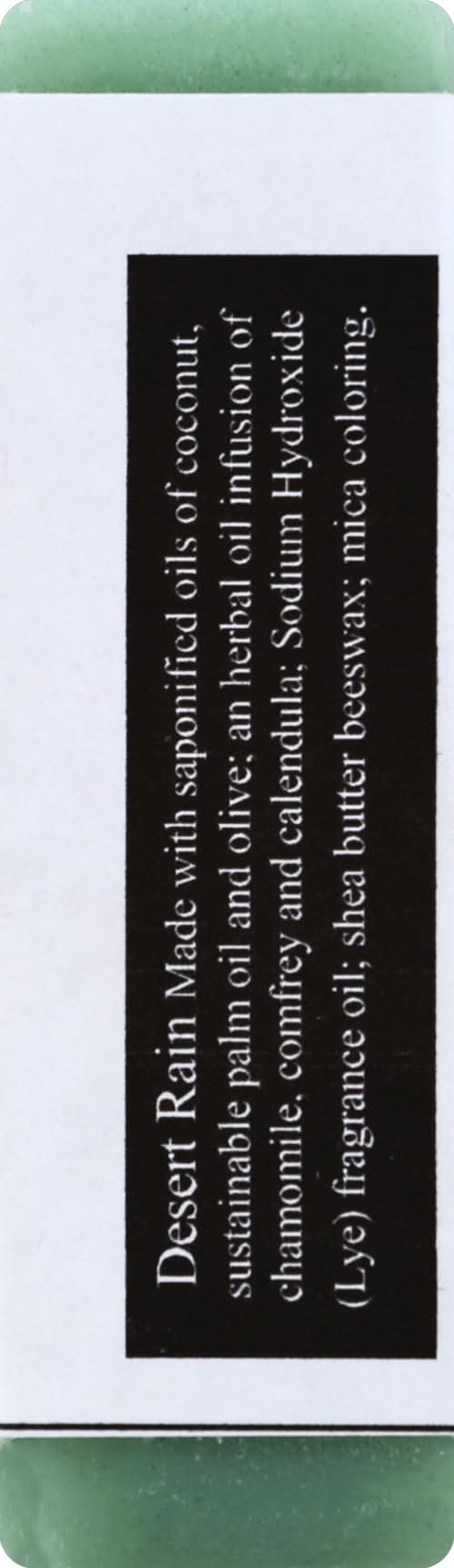 Desert Rain Made with Saponified Oils of Coconut, Sustainable Palm Oil and Olive; an Herbal Oil Infusion of Chamomile, Comfrey and Calendula; Sodium Hydroxide (Lye) Fragrance Oil; Shea Butter Beeswax; Mica Coloring Contains: Tree Nuts