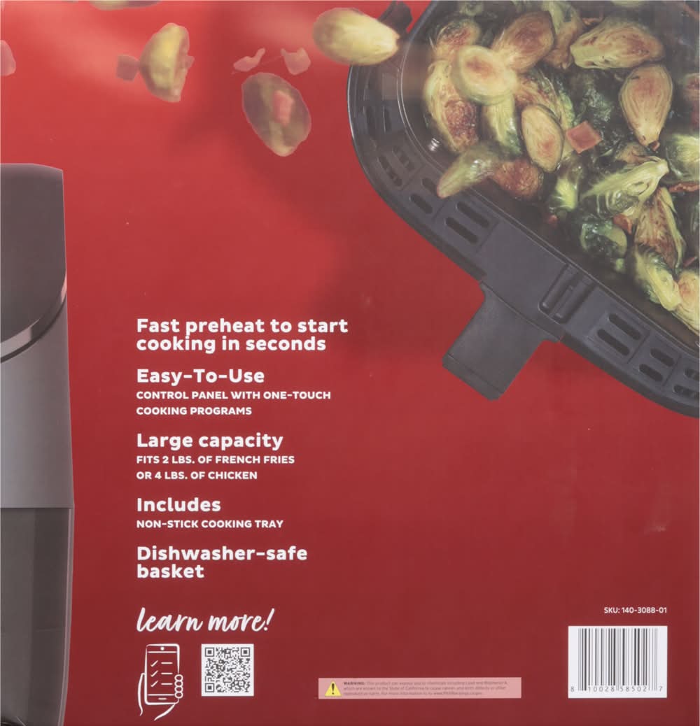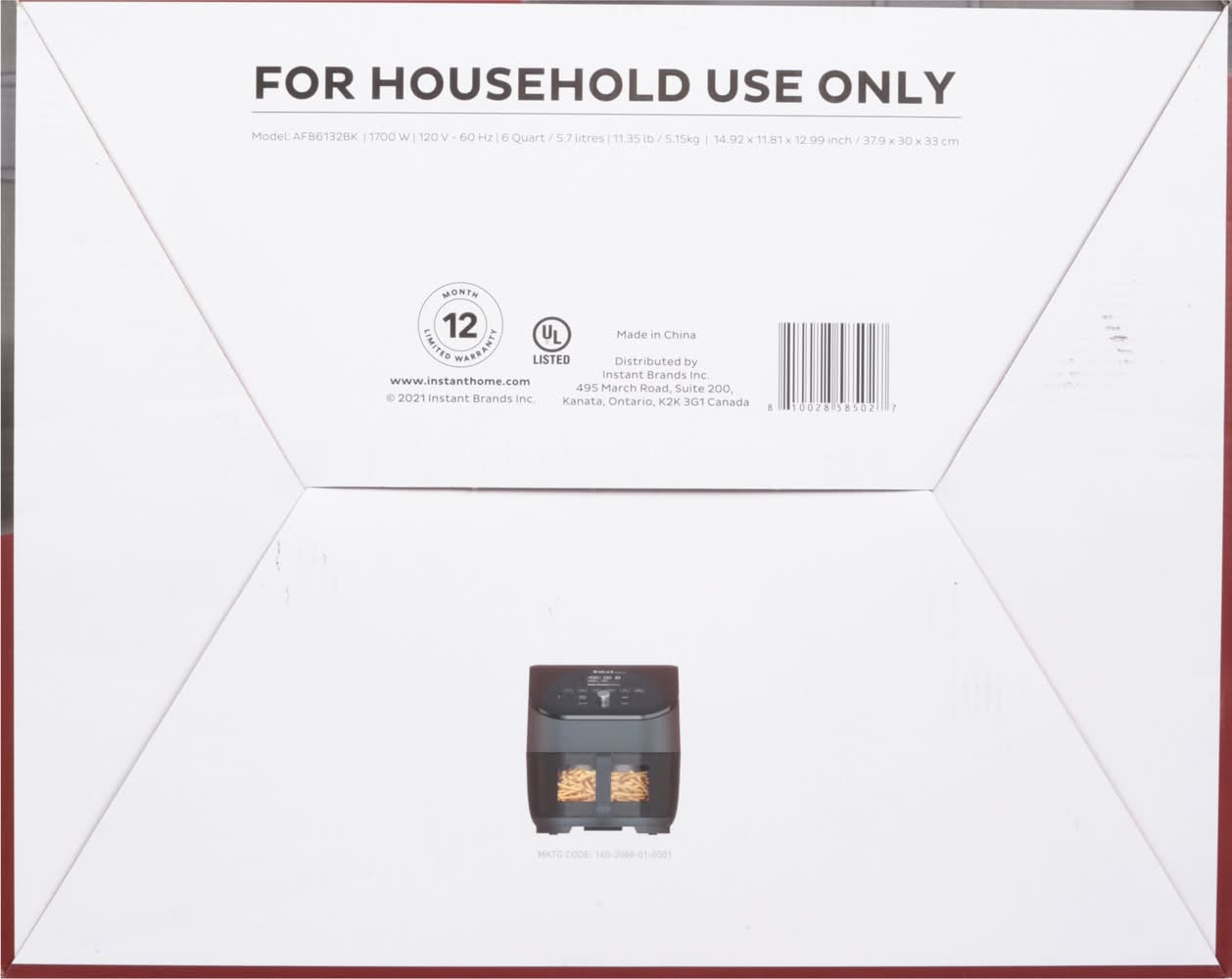 AFB6132BK 1700W. 120V-60 Hz. 6 Quarts / 5.7 litres. 11.35 lb / 5.15kg. 14.92 x 11.81 x 12.99 inch/ 37.9 x 30 x 33 cm. 6 in 1 air fry, bake, broil, dehydrate, reheat and roast. Crispy food made with 95% less oil (Compared to deep frying). Evencrisp technology creates the perfect crunch. 6 One-touch cooking programs. Clearcook window to monitor cooking. Discover amazing. Fast preheat to start cooking in seconds. Easy-to-use control panel with one-touch cooking programs. Large capacity fits 2 lbs. of French fries or 4 lbs. of chicken. Includes non-stick cooking tray. Dishwasher-safe basket. For household use only. 12 months limited warranty. www.instanthome.com. Made in China. Instant Brands Inc.,