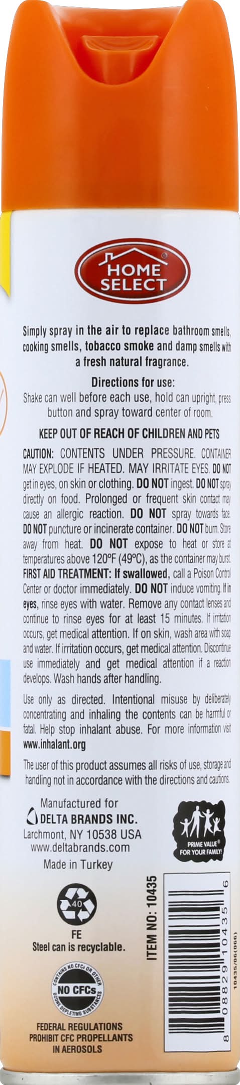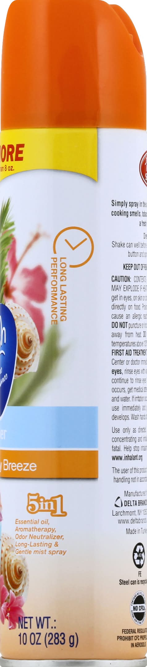 5 in 1 essential oil, aromatherapy, odor neutralizer, long-lasting & gentle mist spray. 25% more ounces than 8 oz. Long lasting performance. Simply spray in the air to replace bathroom smells, cooking smells, tobacco smoke and damp smells with a fresh natural fragrance. Contains no CFCs or other ozone depleting substances. Federal regulations prohibit CFC propellants in aerosols. Prime value for your family. www.deltabrands.com. Steel can is recyclable. Made in Turkey. • Delta Brands, Larchmont, NY 10538. • Packaging: Reusable