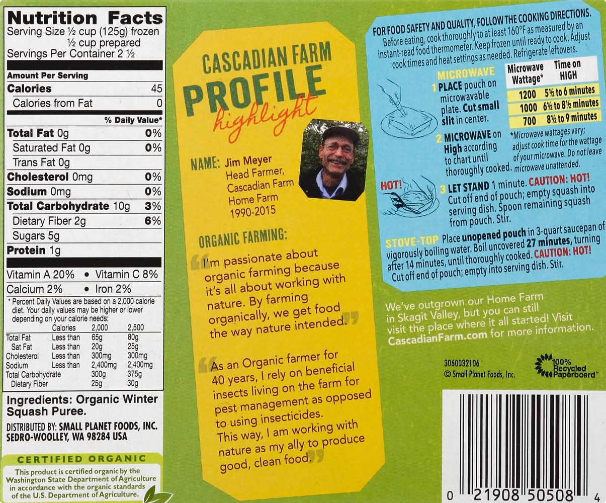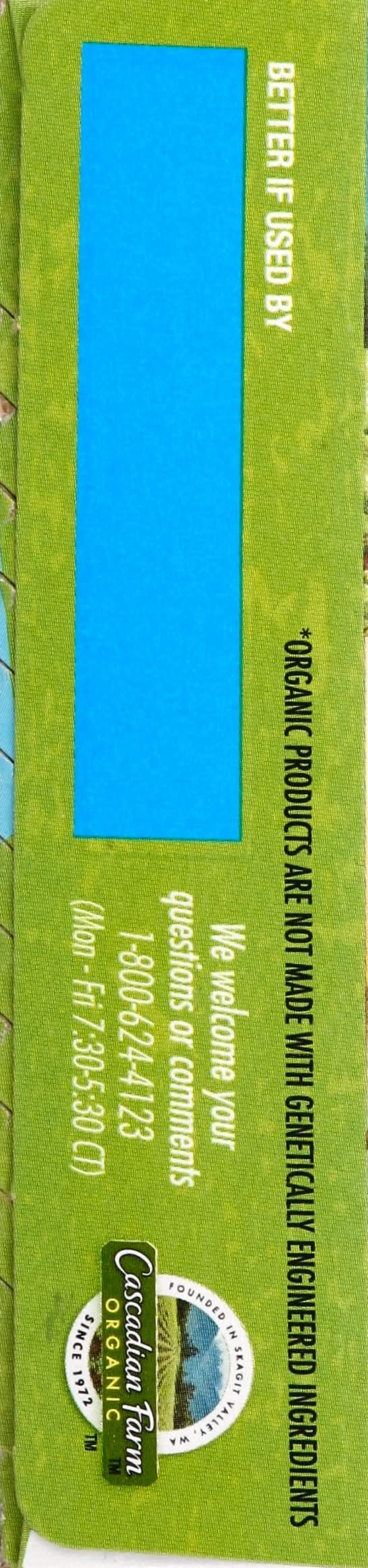 Visit our home farm Skagit Valley, WA. Since 1972. Organically farmed. Non-GMO (Organic products are not made with genetically engineered ingredients.). Non GMO Project verified. USDA organic. Certified Organic: This product is certified organic by the Washington State Department of Agriculture in accordance with the organic standards of the US Department of Agriculture. Cascadian Farm Profile Highlight: Name: Jim Meyer Head Farmer, Cascadian Farm, Home Farm, 1990-2015. Organic Farming: I'm passionate about organic farming because it's all about working with nature. By farming organically, we get food the way nature intended. We've outgrown our Home Farm in Skagit Valley, but you can still visit the place where it all started! Visit CascadianFarm.com for more information. 100% recycled paperboard. We welcome your questions or comments 1-800-624-4123 (Mon-Fri 7:30-5:30 CT). For more information or recipe ideas please visit www.CascadianFarm.com. how2recycle.info.