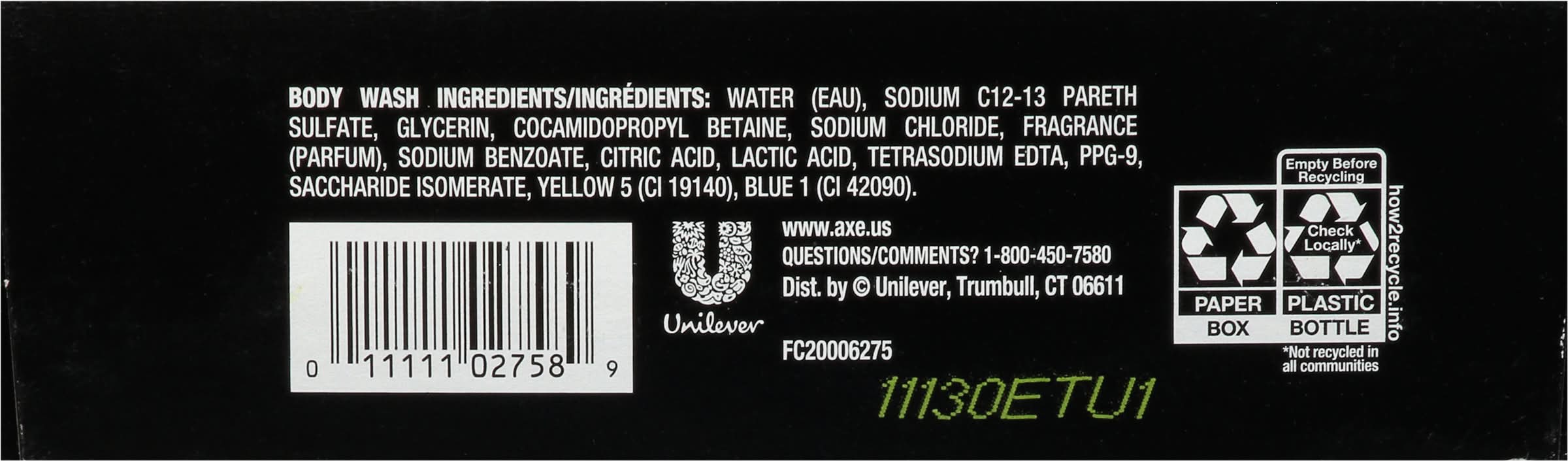 12h refreshing scent. Double up & save. Great value. Clean. Hydrate. Smell refreshed for 12hrs. Black body wash. Step out of the shower feeling great and smelling like the unique Axe black fragrance, with notes of frozen pear & cedar wood. With 100% plant-based moisturizers. No parabens. Dermatologist tested. Smells 100% awesome. Clean rinse. Washes away odor causing bacteria. Unilever. www.axe.us. how2recycle.info. Questions/Comments? 1-800-450-7580. Check locally (not recycled in all communities). Unilever,