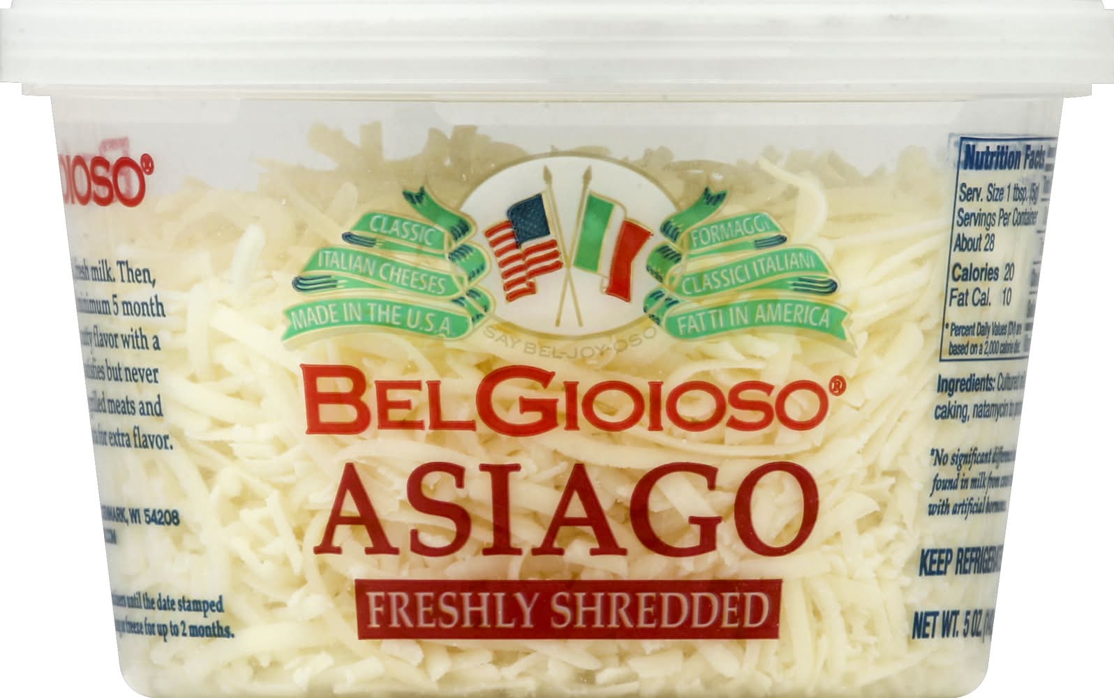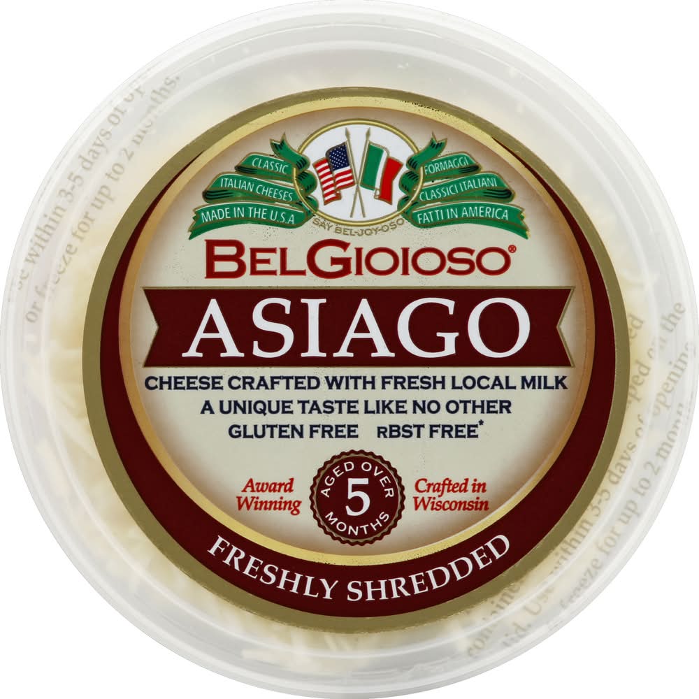 Say Bel-joy-oso. Cheese crafted with fresh local milk. A unique taste like no other. Gluten free. rBST free (No significant difference has been found in milk from cows treated with artificial hormones). Award winning. Aged over 5 months. Asiago begins with local, fresh milk. Then, careful handcrafting and minimum 5 month aging produce a sweet, nutty flavor with a hint of sharpness that satisfies but never overpowers. Melt over grilled meats and vegetables, or add to pasta for extra flavor. Belgioioso.com. Classic Italian cheeses made in the USA. Crafted in Wisconsin.
