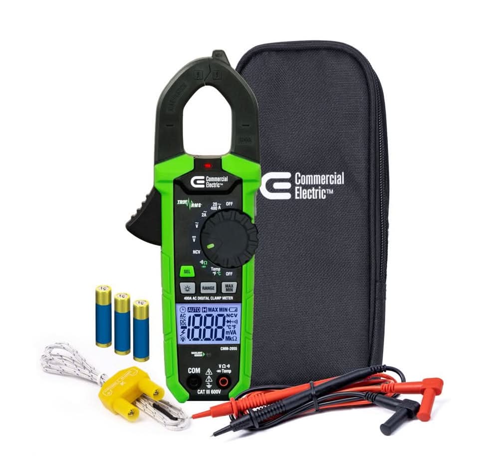 The Commercial Electric 400 Amp AC True RMS Digital Clamp Meter with Temperature (CMM-2055) is a versatile meter designed to measure a variety of electrical parameters. It uses a clamp to measure AC current and a non-contact voltage tester (NCVT), while also utilizing test leads to measure both AC and DC voltage, resistance, and continuity. For temperature measurements, it is equipped with a thermocouple. The meter features automatically ranging True Root Mean Squared (TRMS) measurement technology, ensuring high accuracy in readings. Additionally, its backlit LCD screen facilitates easy viewing even in low light conditions, making it a practical tool for diverse testing scenarios.