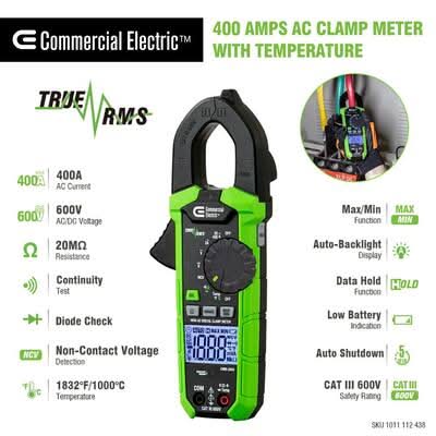 Commercial Electric 400 Amp Ac True Rms Digital Clamp Meter With Temperature