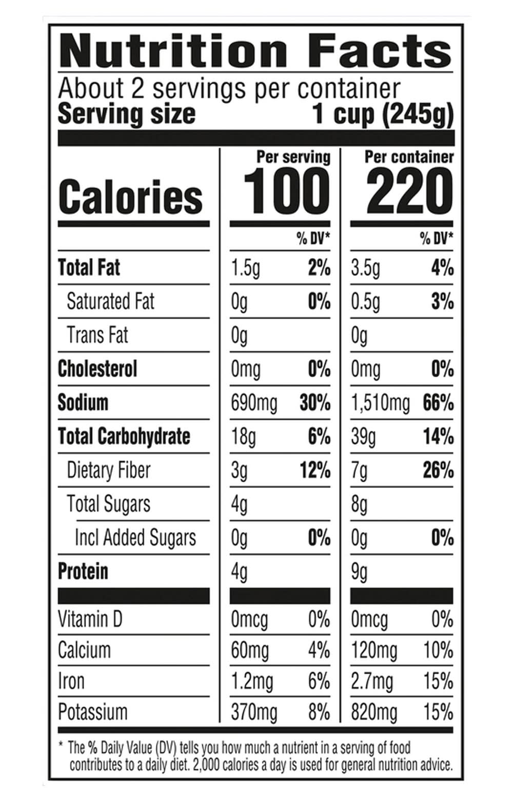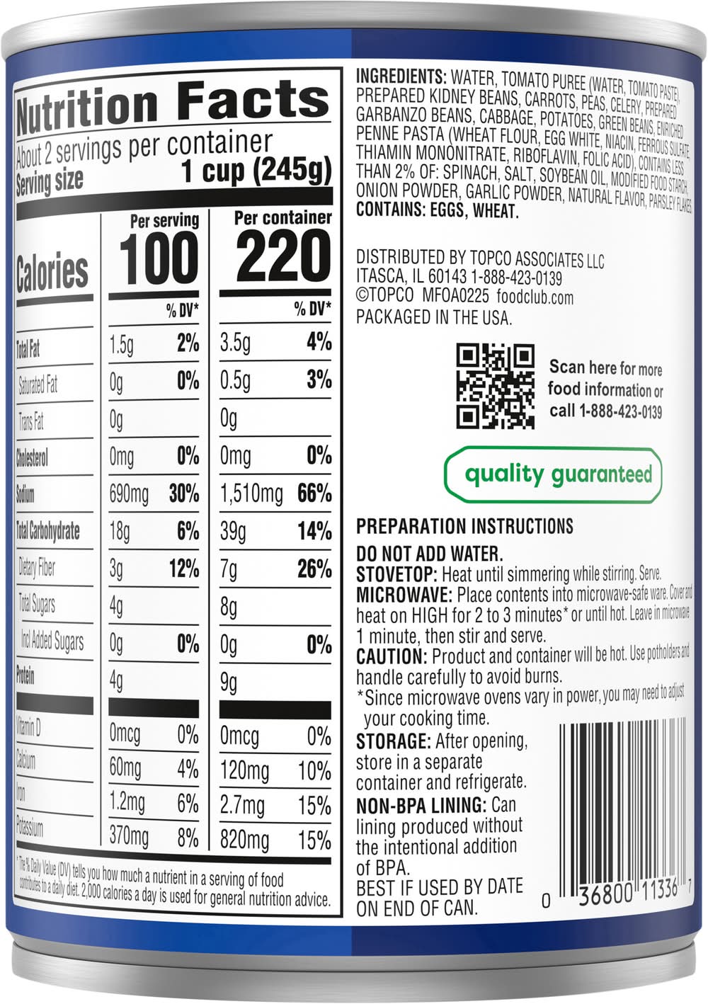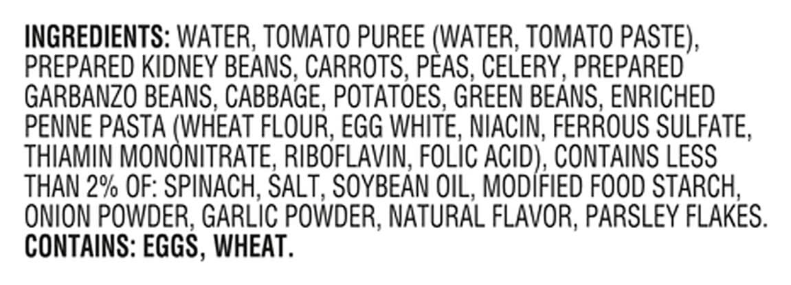 Water, Tomato Puree (Water, Tomato Paste), Prepared Kidney Beans, Carrots, Peas, Celery, Prepared Garbanzo Beans, Cabbage, Potatoes, Green Beans, Enriched Penne Pasta (Wheat Flour, Egg White, Niacin, Ferrous Sulfate, Thiamin Mononitrate, Riboflavin, Folic Acid), Contains Less than 2% of: Spinach, Salt, Soybean Oil, Modified Food Starch, Onion Powder, Garlic Powder, Natural Flavor, Parsley Flakes Contains: Eggs, Wheat, Celery, Soybeans