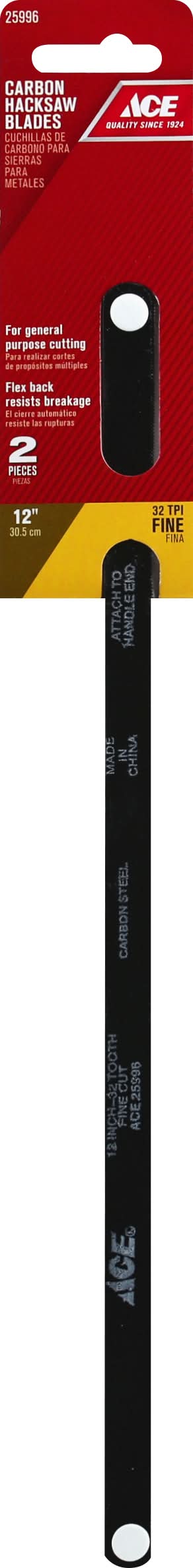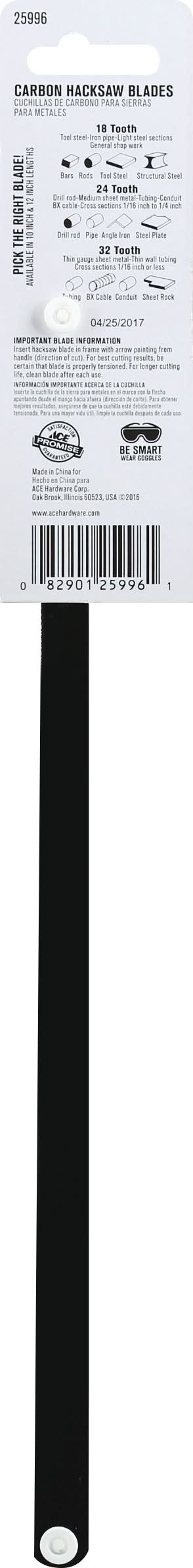 12 in (30.5 cm) Quality since 1924. For general purpose cutting. Flex back resists breakage. 32 TPI fine. Pick the right blade! Available in 10 inch & 12 inch lengths. 18 Tooth: Tool steel-iron pipe-light steel sections general shop work. Bars; rods; tool steel; structural steel. 24 Tooth: Drill rod-medium sheet metal-tubing-conduit BX cable-cross setions 1/16 inch to 1/4 inch. Drill pod; pipe; angle iron; steel plate. 32 Tooth: Thin gauge sheet metal-thin wall tubing cross sections 1/6 inch or less. Tubing; BX cable; conduit; sheet rock. Ace Promise: Satisfaction guaranteed. www.acehardware.com. Made in China. ACE HARDWARE,