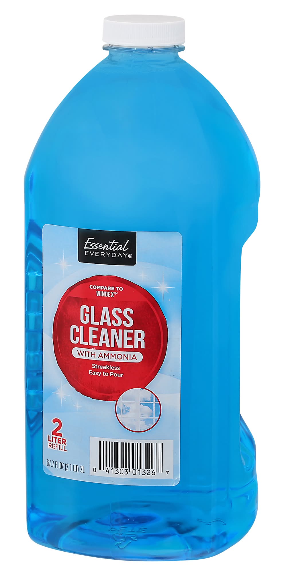 Compare to Windex. Streakless. Easy to pour. Essential Everyday Streakless Glass Cleaner. Leaves a streak-free shine! Great for glass, mirrors, chrome, and more. With ammonia cleaning power. 100% Quality guaranteed. Like it or let us make it right. That's quality promise. essentileveryday.com. For more ingredient information, visit www.essentialeveryday.com or call 1-855-423-2630. Product of USA. • Unfi, Eden Prairie , MN , 55344 • Packaging: Reusable