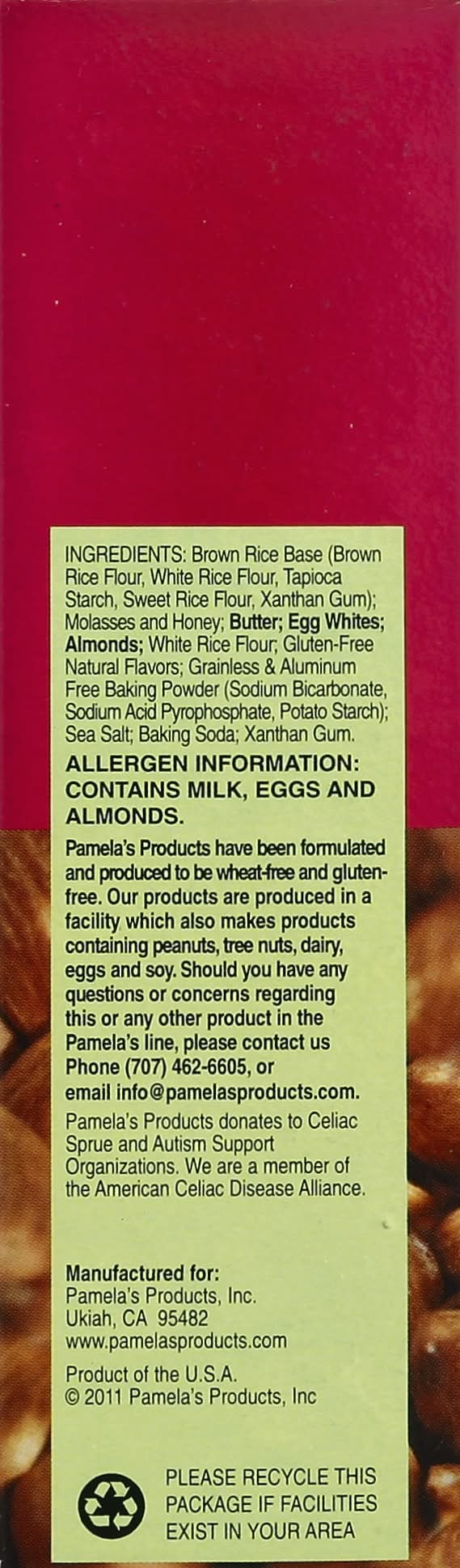 Brown Rice Base (Brown Rice Flour, White Rice Flour, Tapioca Starch, Sweet Rice Flour, Xanthan Gum), Molasses and Honey, Butter, Egg Whites, Almonds, White Rice Flour, Gluten-Free Natural Flavors, Grainless & Aluminum Free Baking Powder (Sodium Bicarbonate, Sodium Acid Pyrophosphate, Potato Starch), Sea Salt, Baking Soda, Xanthan Gum Contains: Milk, Eggs, Tree Nuts, Peanuts, Soybeans