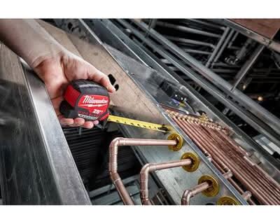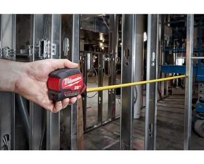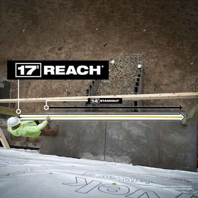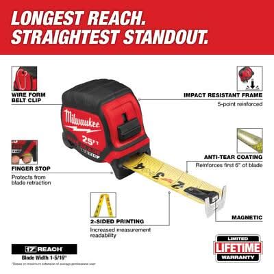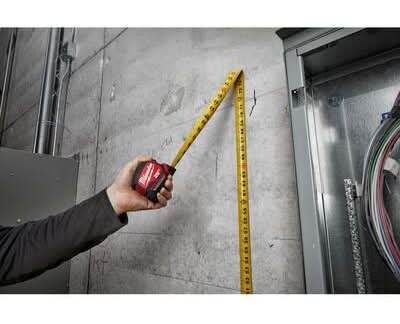 Wide Blade Magnetic Tape Measures have the longest reach and straightest standout in the industry. Users can reach further on the jobsite with up to 17 ft. of reach to take long measurements on their own. The Milwaukee blade design provides the straightest standout, reducing blade arc for efficient and accurate measuring. A magnetic hook easily attaches to EMT and steel studs. The tape measures are wear and impact-resistant with nylon bond blade protection and an additional anti-tear coating on the first 6 ft. of the blade, reducing tape tear. Built to withstand the jobsite, the measuring tapes are constructed with a 5-point reinforced frame for impact resistance.