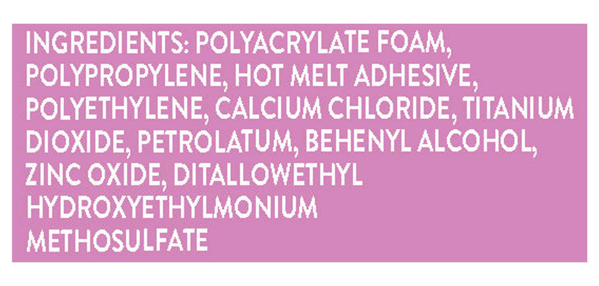 Ingredients: Polyacrylate Foam, Polypropylene, Hot Melt Adhesive, Polyethylene, Calcium Chloride, Titanium Dioxide, Petrolatum, Behenyl Alcohol, Zinc Oxide, Ditallowethyl Hydroxyethylmonium Methosulfate