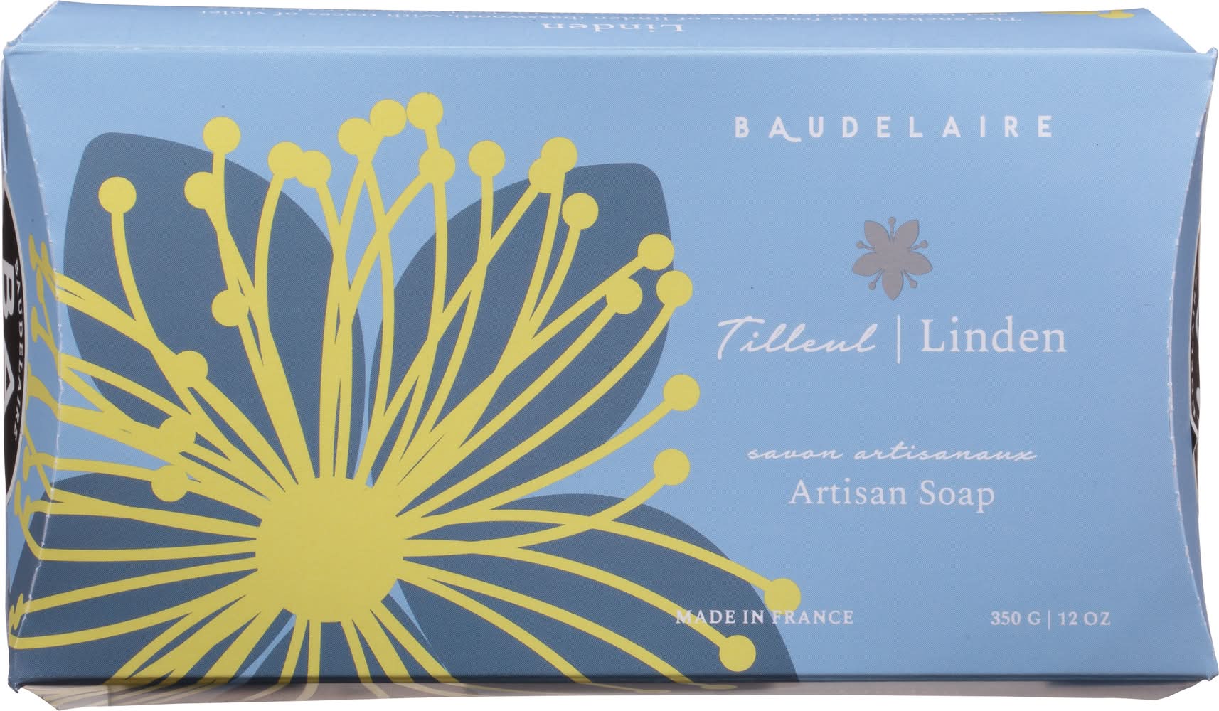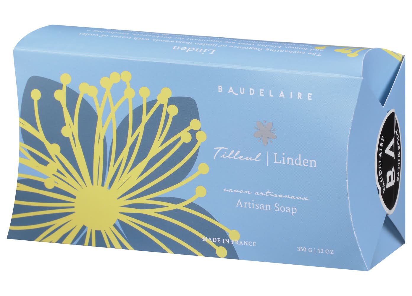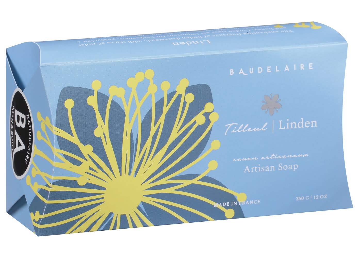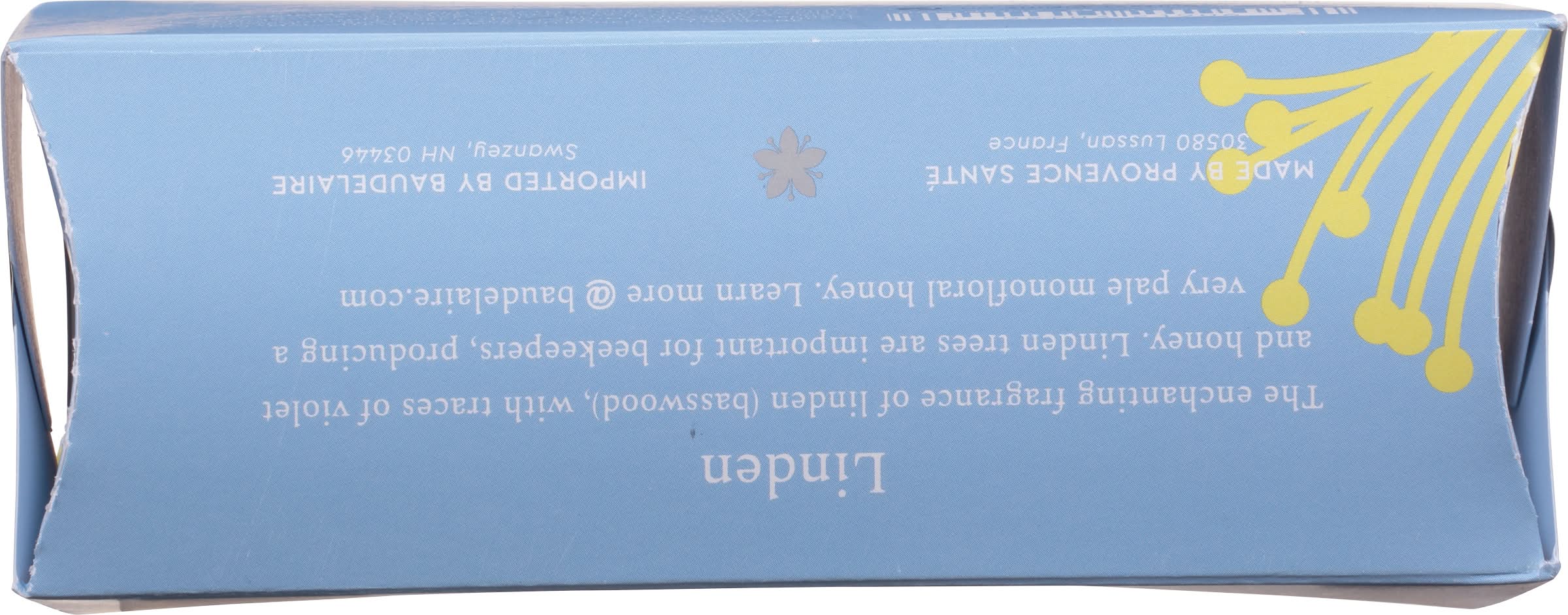 Triple-milled soap enriched with moisturizing shea butter. Bath & body. The enchanting fragrance of linden (basswood), with traces of violet and honey. Linden trees are important for beekeepers, producing a very pale monofloral honey. Fragrant Provencal triple-milled soap enriched with moisturizer shea butter. baudelaire.com. Learn more (at)baudelaire.com. 100% recyclable package. No animal testing. Please recycle. Made in France. Baudelaire,