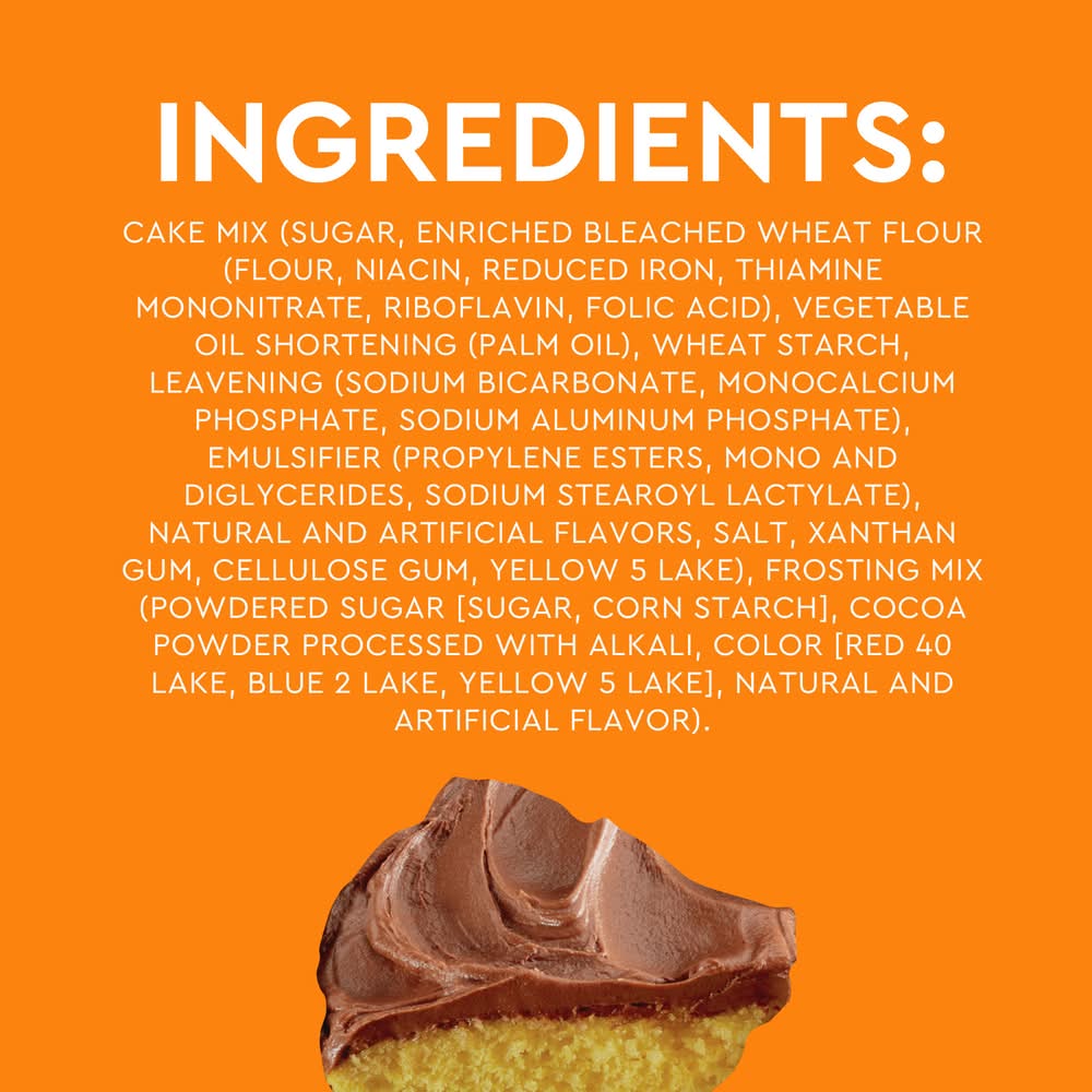 Ingredients: INGREDIENTS: CAKE MIX, SUGAR, ENRICHED BLEACHED WHEAT FLOUR (WHEAT FLOUR, NIACIN, REDUCED IRON, THIAMINE MONONITRATE, RIBOFLAVIN, FOLIC ACID), VEGETABLE OIL SHORTENING (PALM OIL), WHEAT STARCH, LEAVENING (BAKING SODA, MONOCALCIUM PHOSPHATE, SODIUM ALUMINUM PHOSPHATE), EMULSIFIER (PROPYLENE ESTERS, MONO AND DIGLYCERIDES, SODIUM STEAROYL LACTYLATE), NATURAL AND ARTIFICIAL FLAVOR, SALT, XANTHAN GUM, CELLULOSE GUM, YELLOW 5 LAKE, . FROSTING, SUGAR, SHORTENING (PALM OIL, CANOLA OIL, MONO- AND DIGLYCERIDES, POLYSORBATE 60), WATER, COCOA POWDER, CORN SYRUP, CONTAINS 2% OR LESS OF: CORNSTARCH, SALT, PRESERVATIVES (ROSEMARY EXTRACT, POTASSIUM SORBATE), INVERT SUGAR, NATURAL FLAVOR, CITRIC ACID, . Contains: Wheat