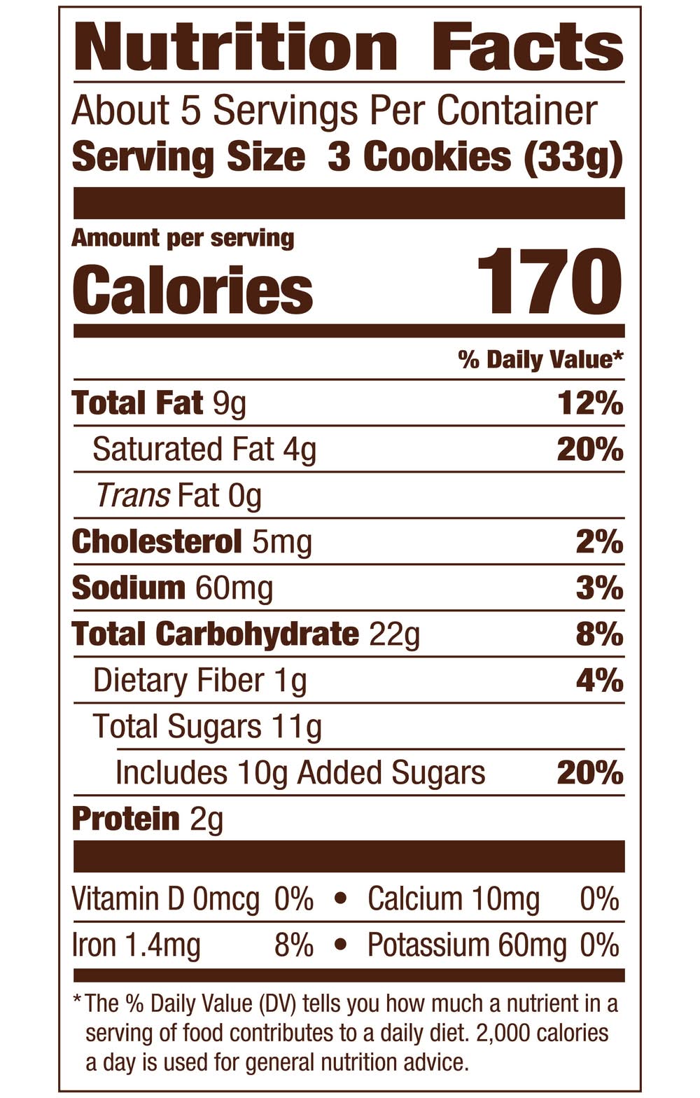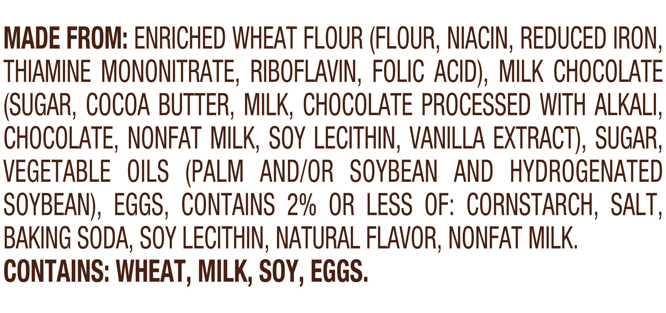 Ingredients: MADE FROM: ENRICHED WHEAT FLOUR (FLOUR, NIACIN, REDUCED IRON, THIAMINE MONONITRATE, RIBOFLAVIN, FOLIC ACID), MILK CHOCOLATE (SUGAR, COCOA BUTTER, MILK, CHOCOLATE PROCESSED WITH ALKALI, CHOCOLATE, NONFAT MILK, SOY LECITHIN, VANILLA EXTRACT), SUGAR, VEGETABLE OILS (PALM AND/OR SOYBEAN AND HYDROGENATED SOYBEAN), EGGS, CONTAINS 2% OR LESS OF: CORNSTARCH, SALT, BAKING SODA, SOY LECITHIN, NATURAL FLAVOR, NONFAT MILK. CONTAINS: WHEAT, MILK, SOY, EGGS. Contains: Wheat, Milk, Soybeans, Eggs, Corn