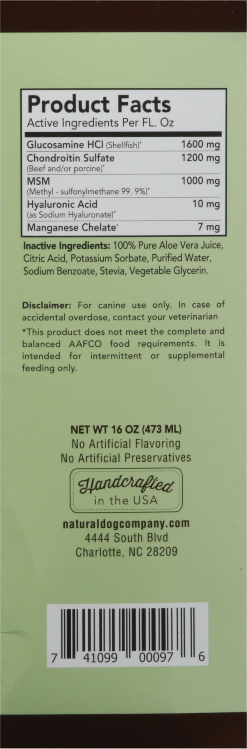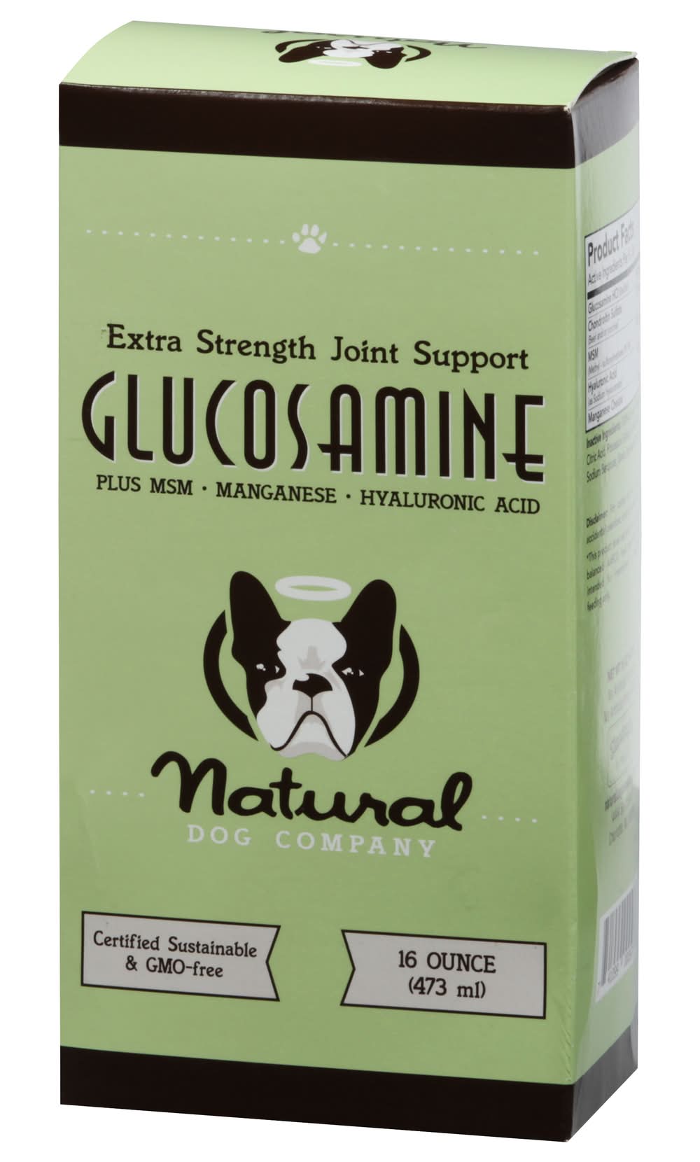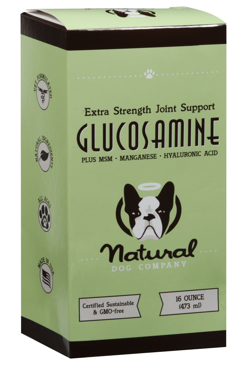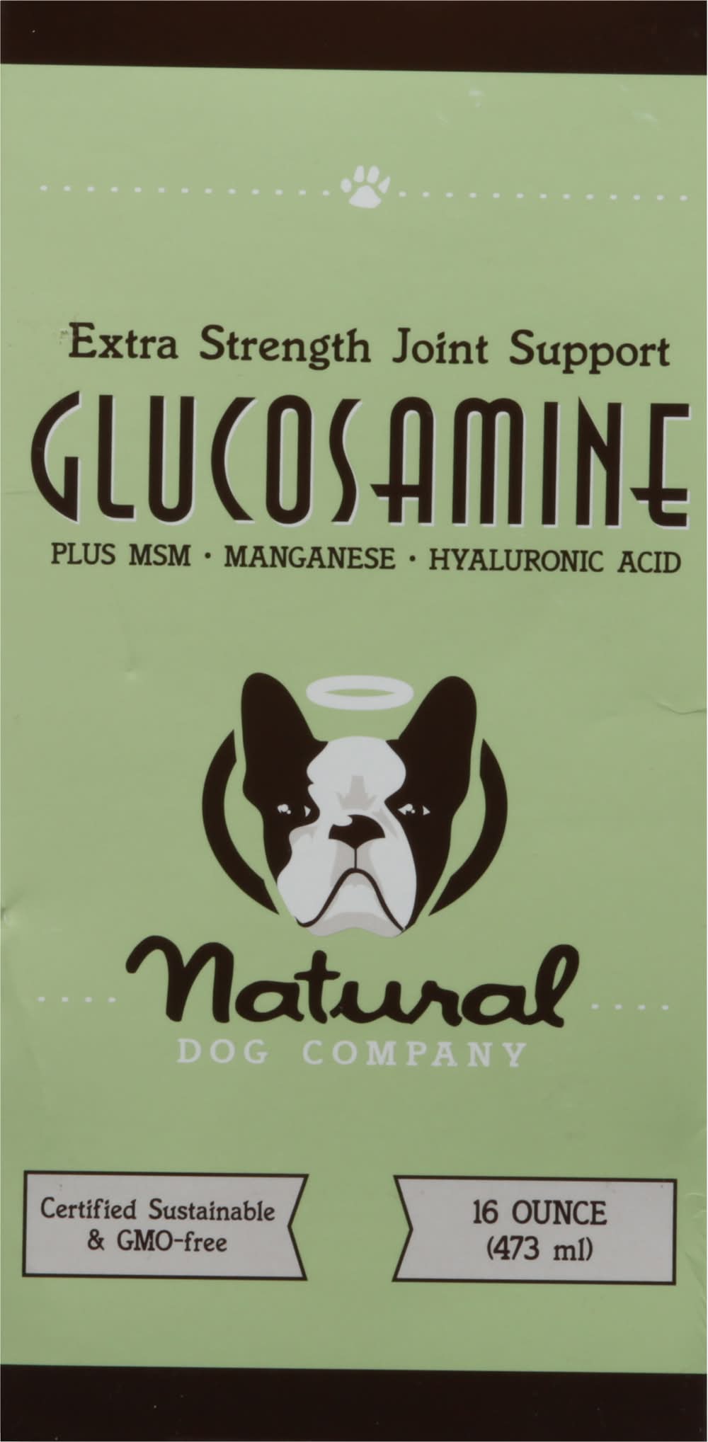 No artificial flavoring. No artificial preservatives. GMO-Free. Plus MSM. Manganese. Hyaluronic Acid. Vet formulated. All ages. Natural Dog Company's Liquid Glucosamine supports joint function, cartilage health, and overall mobility for dogs of all ages and sizes. This powerhouse formula prevents joint and cartilage deterioration and provides fast-acting relief from sore, stiff joints in dogs with arthritis and hip dysplasia. Alleviates joint pain, stiffness, & arthritis symptoms. Prevents breakdown of cartilage & connective tissue. Decreases inflammation & improves overall mobility. naturaldogcompany.com. Certified Sustainable. Made in USA. Handcrafted in the USA. • Natural Dog Company, • Packaging: Reusable