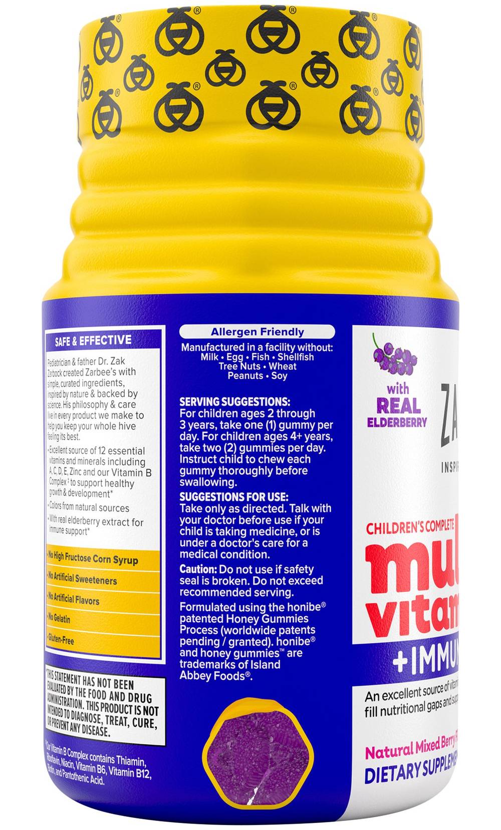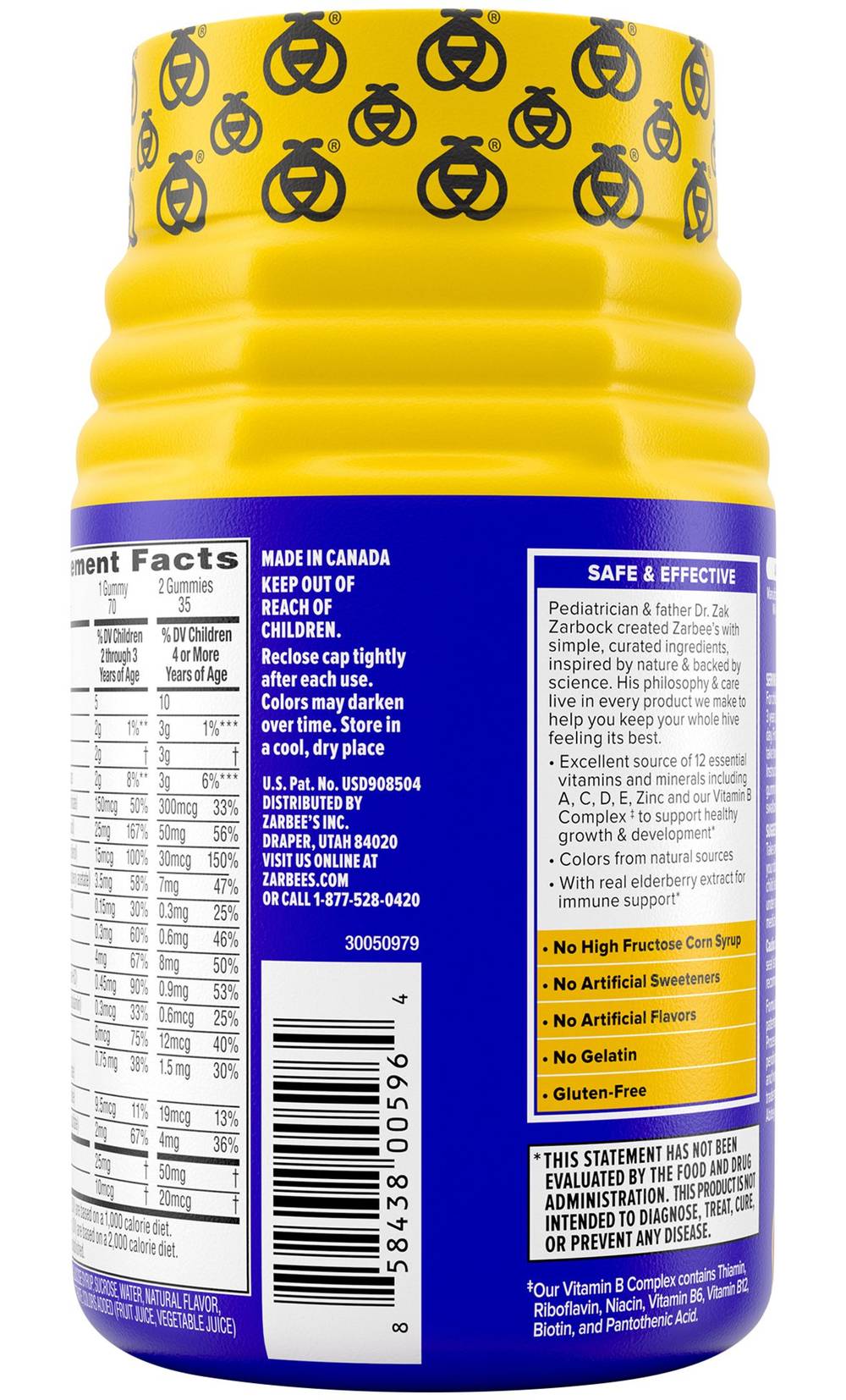It is a dietary supplement containing 70 servings per bottle. It is formulated without artificial flavors and is gluten-free. This product provides an excellent source of vitamins A, C, D, and E along with 12 essential vitamins and minerals to support children's healthy growth and development. It includes a Vitamin B Complex consisting of thiamin, riboflavin, niacin, vitamin B6, vitamin B12, biotin, and pantothenic acid. The supplement also contains real elderberry extract to aid in immune support. Zarbee's avoids using high fructose corn syrup, artificial sweeteners, and gelatin in this product, opting instead for colors derived from natural sources. While colors may darken over time, this does not affect the product's potency or safety. It is manufactured in Canada. Please note that the statements regarding dietary supplements have not been evaluated by the Food and Drug Administration, and this product is not designed to diagnose, treat, cure, or prevent any disease. Zarbee's Inc, Draper, UT, 84020