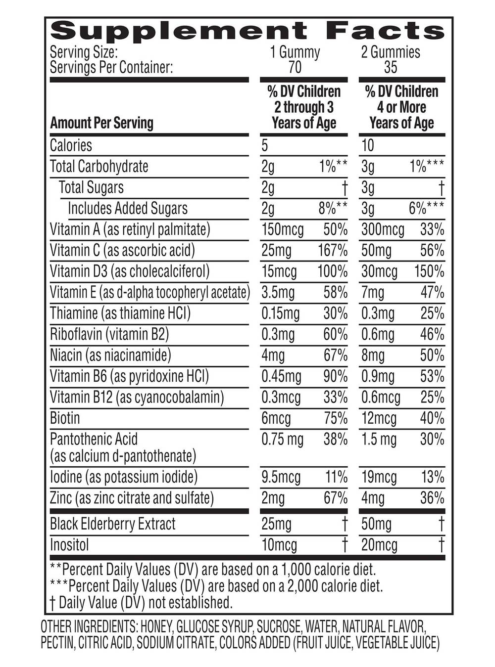 Serving Size: 1 Gummy Vitamin A (as retinyl palmitate): 150 mcg, Vitamin C (as ascorbic acid): 25 mg, Vitamin D3 (as cholecalciferol): 15 mcg, Vitamin E (as d-alpha tocopheryl acetate): 3.5 mg, Thiamin (as thiamine HCl): 0.15 mg, Riboflavin (vitamin B2): 0.3 mg, Niacin (as niacinamide): 4 mg, Vitamin B6 (as pyridoxine HCl): 0.45 mg, Vitamin B12 (as cyanocobalamin): 0.3 mg, Biotin: 6 mcg, Iodine (as potassium iodide): 10 mcg, Zinc (as zinc citrate and zinc sulfate): 2 mg, Black Elderberry Fruit Extract: 25 mg, Inositol: 10 mcg Serving Size: 2 Gummies Vitamin A (as retinyl palmitate): 300 mcg, Vitamin C (as ascorbic acid): 50 mg, Vitamin D3 (as cholecalciferol): 30 mcg, Vitamin E (as d-alpha tocopheryl acetate): 7 mg, Thiamin (as thiamine HCl): 0.3 mg, Riboflavin (vitamin B2): 0.6 mg, Niacin (as niacinamide): 8 mg, Vitamin B6 (as pyridoxine HCl): 0.9 mg, Vitamin B12 (as cyanocobalamin): 0.6 mg, Biotin: 12 mcg, Iodine (as potassium iodide): 19 mcg, Zinc (as zinc citrate and zinc sulfate): 4 mg, Black Elderberry Fruit Extract: 50 mg, Inositol: 20 mcg OTHER INGREDIENTS: HONEY, GLUCOSE SYRUP, SUCROSE, WATER, NATURAL FLAVOR, CONTAINS 2% OR LESS OF PECTIN, CITRIC ACID, SODIUM CITRATE, COLORED WITH CARROT AND BLACKCURRANT CONCENTRATE