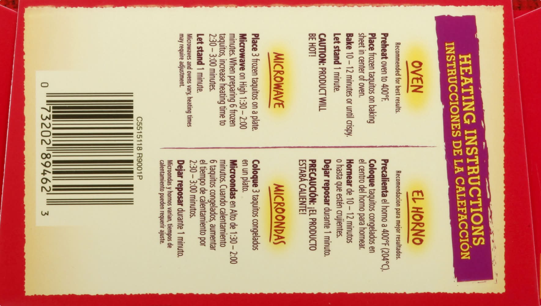Directions for use: Heating Instructions: Oven: Recommended for best results. Preheat oven to 400 degrees F. Place frozen taquitos on baking sheet in center of the oven. Bake 10-12 minutes or until crispy. Let stand 1 minute. Microwave: Place 3 frozen taquitos on a plate. Microwave on high 1:30 - 2:00 minutes. When preparing 6 frozen taquitos, increase heating time to 2:30 - 3:00 minutes. Let stand 1 minute. Caution: Product will be hot. Microwaves and ovens vary, heating times may require adjustment. Keep frozen. Storage recommendation: Keep frozen.