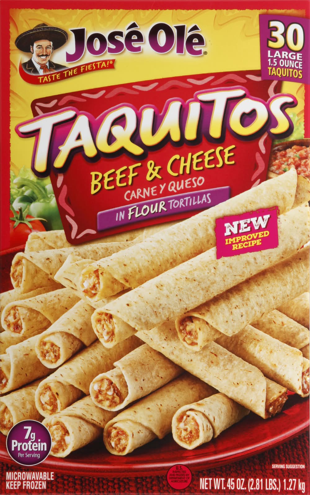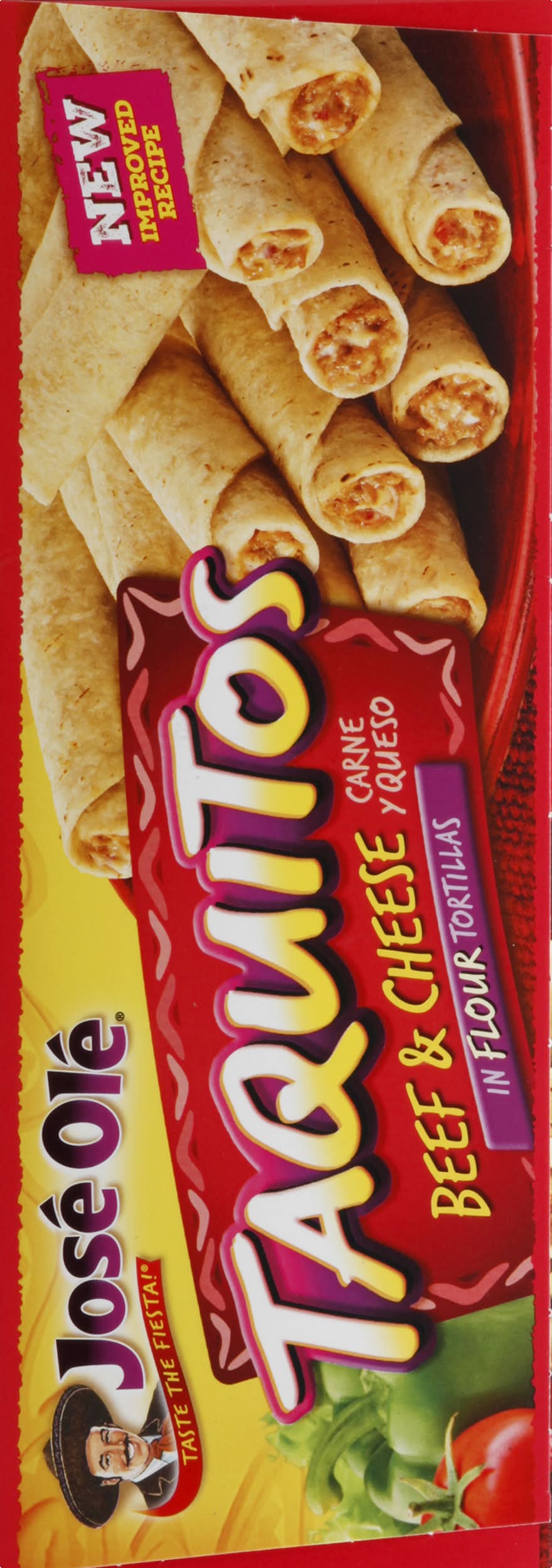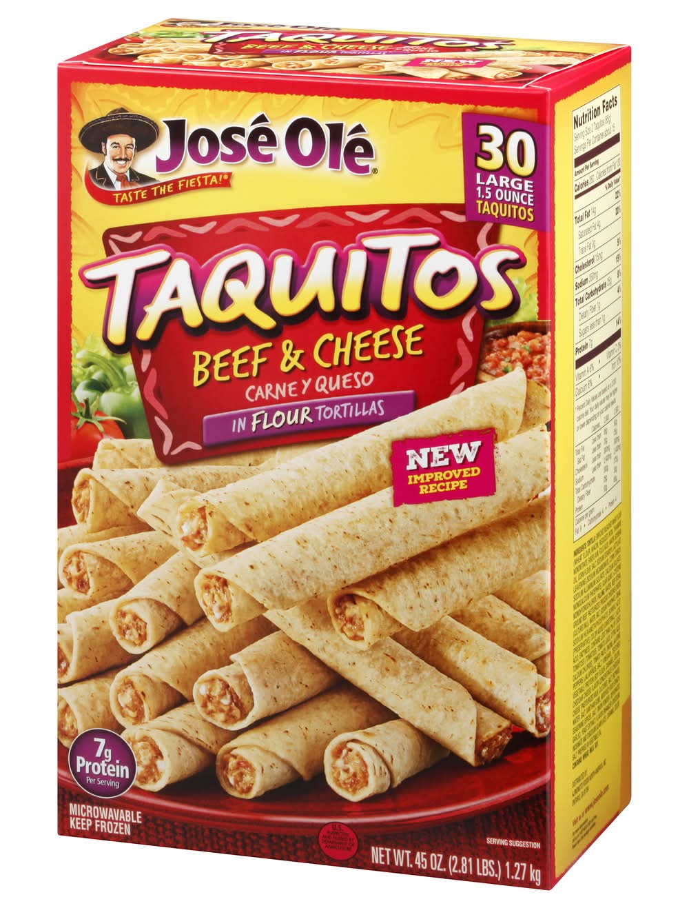 Carne y queso in flour tortillas. 7 g protein per serving. Taste the fiesta! New improved recipe. Microwable. US inspected and passed by Department of Agriculture. Visit us at joseole.com. For more information call us at 1-877-653-2181 toll free. Please have this package available. • Number of servings: 15 • Ajinomoto Foods North America, Ontario, CA, 91764
