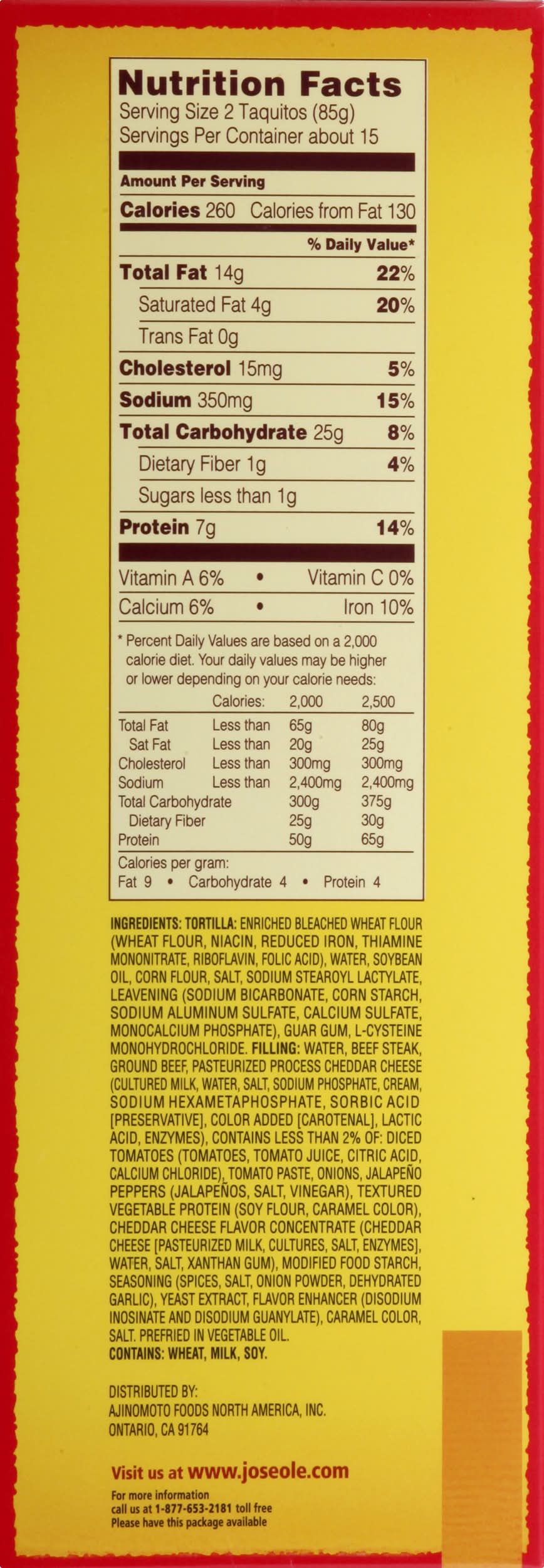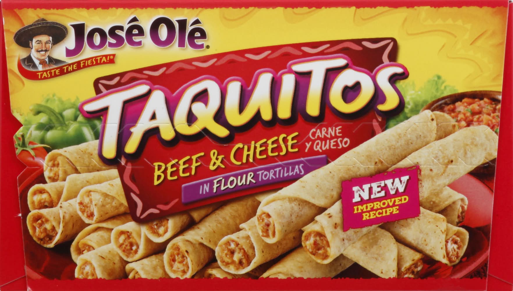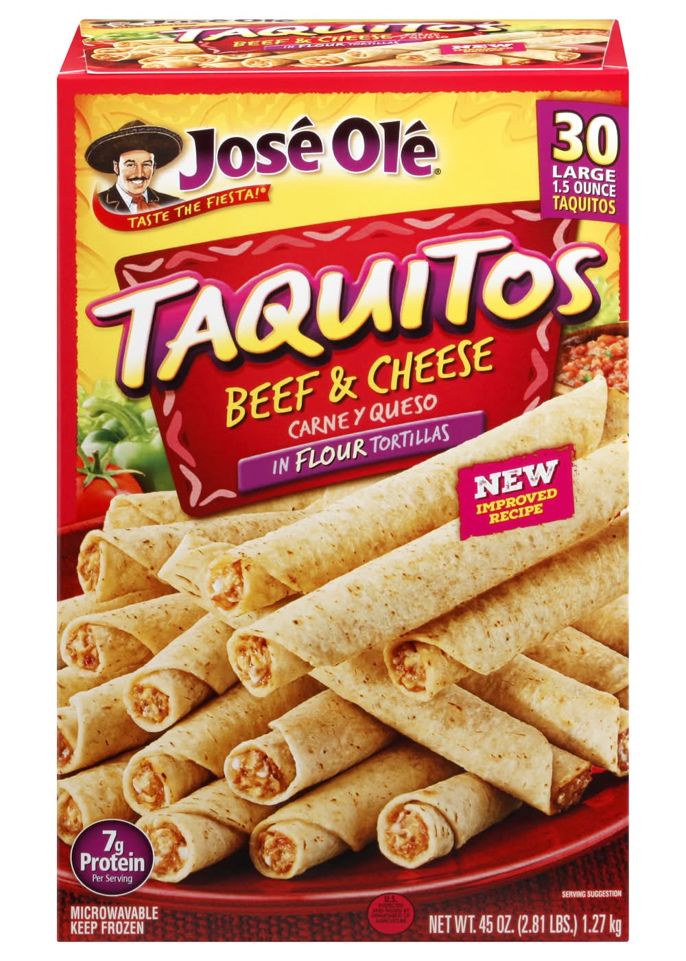 Carne y queso in flour tortillas. 7 g protein per serving. Taste the fiesta! New improved recipe. Microwable. US inspected and passed by Department of Agriculture. Visit us at joseole.com. For more information call us at 1-877-653-2181 toll free. Please have this package available. • Number of servings: 15 • Ajinomoto Foods North America, Ontario, CA, 91764