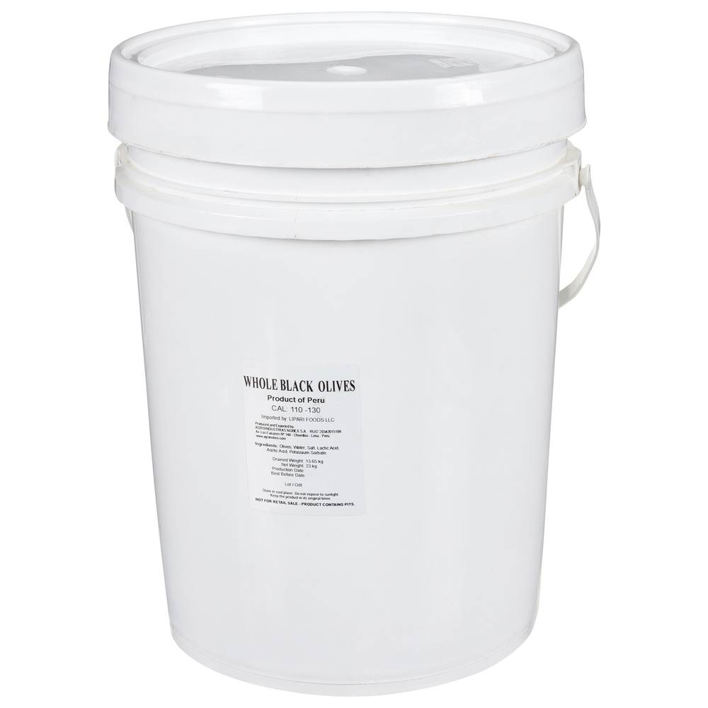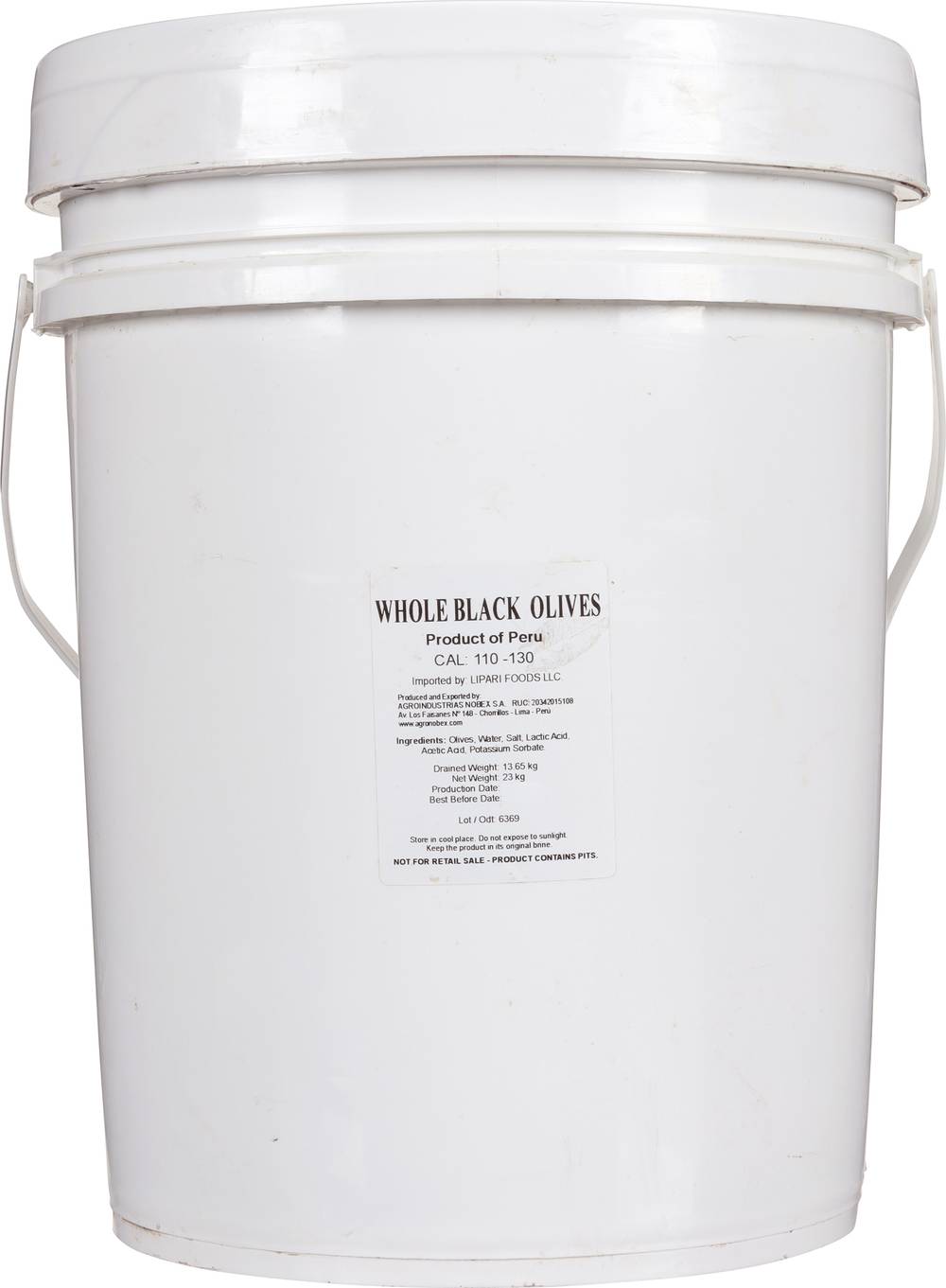 Drained weight: 13.65 kg. Cal: 110-130. Not for retail sale. www.agronobex.com. Product of Peru. • Lipari Foods LLC, • Packaging: Reusable