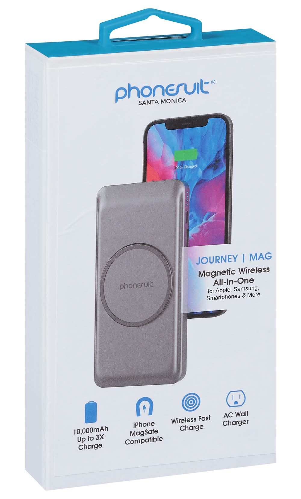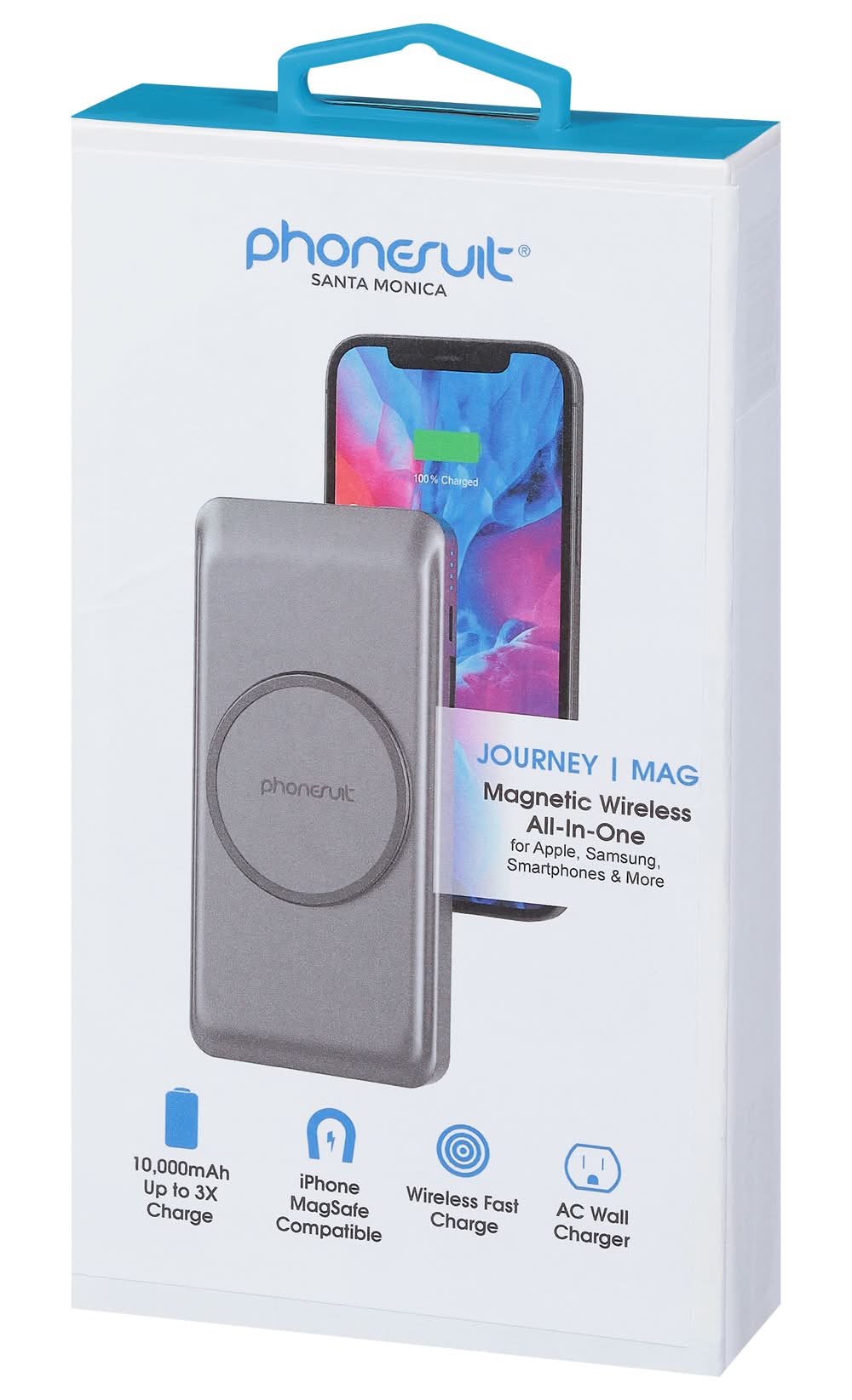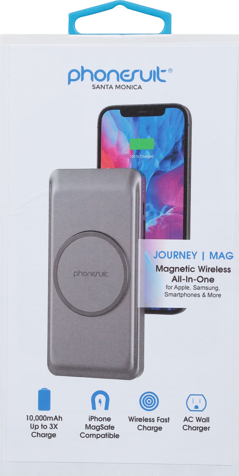 Santa Monica. Journey. Mag. Magnetic wireless all-in-one for apple, Samsung, smartphones & more. 10,000mAh up to 3x charge. IPhone magsafe compatible. Wireless fast charge. AC wall charger. Assembled in China. PhoneSuit Inc.,