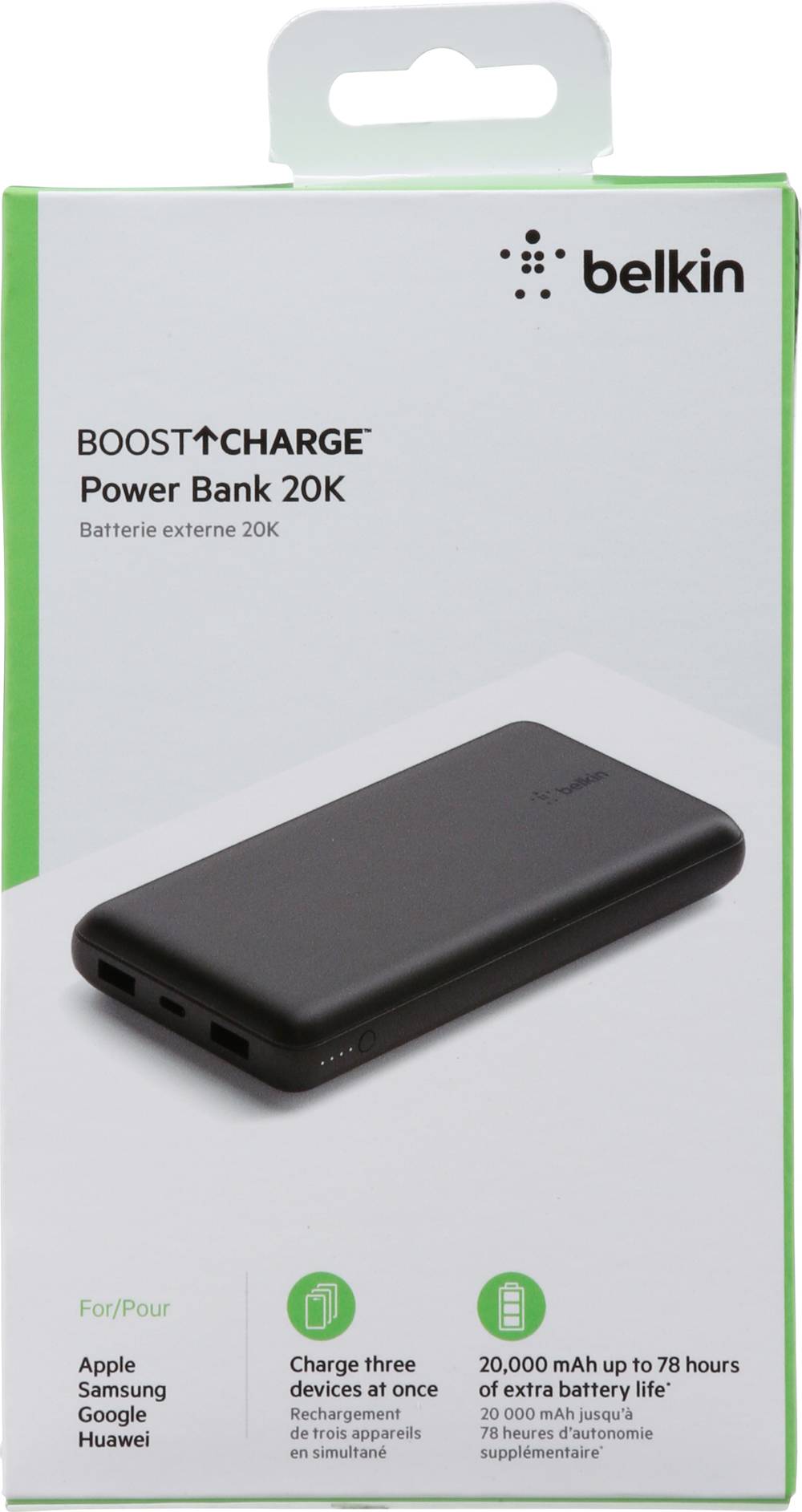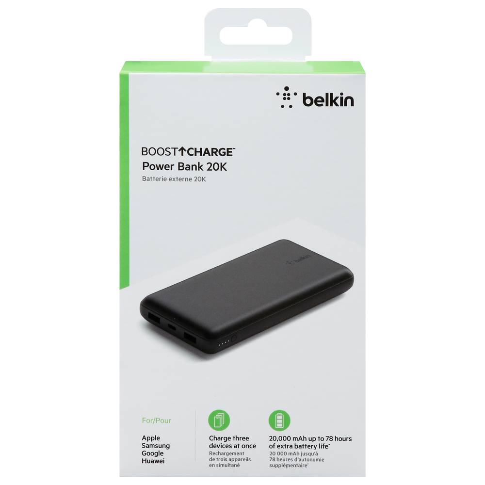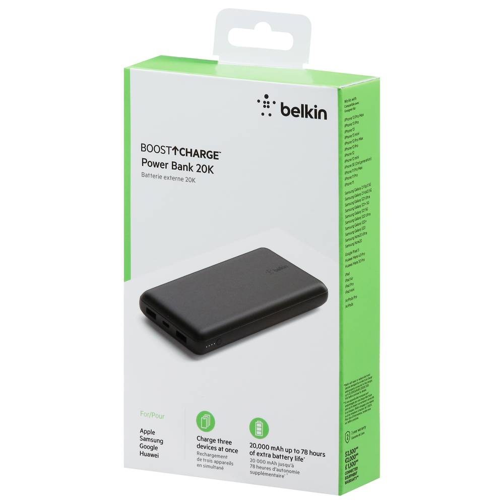 Charge three devices at the same time with our BoostCharge Power Bank 20K. Two USB ports and one USB-C® port keep all your devices powered to provide up to an additional 78 hours of battery life to your smartphone and smart devices. Compatible with most devices. Total 15W of power is shared across all ports when used simultaneously Charge up to three devices at the same time with two 12W USB-A ports and one 15W USB-C port Safety Triangle technology monitors heat, voltage and circuitry for safe operation. Backed by the manufacturer's 2-year limited warranty. Our battery pack products undergo 20+ quality tests and achieve 8+ global certifications, to keep your devices safe for years to come. 20,000 mAH recharges your smartphone for up to 78 hours of additional video playback Charge an iPhone 15 Pro 0-50% in 35 minutes or Galaxy S23 Plus 0-50% in 45 minutes • Color: Black • Packaging: Reusable