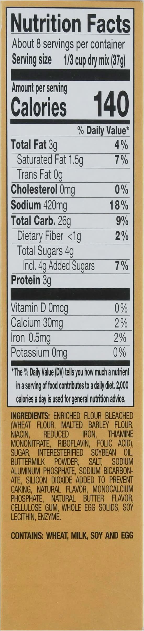 Enriched Flour Bleached (Wheat Flour Malted Barley Flour Niacin Reduced Iron Thiamine Mononitrate Riboflavin Folic Acid), Sugar, Interesterified Soybean Oil, Buttermilk Powder, Salt, Sodium Aluminum Phosphate, Sodium Bicarbonate, Silicon Dioxide Added to Prevent Caking, Natural Flavor, Monocalcium Phosphate, Natural Butter Flavor, Cellulose Gum, Whole Egg Solids, Soy Lecithin, Enzyme Contains: Wheat, Milk, Soybeans, Eggs Additives: None
