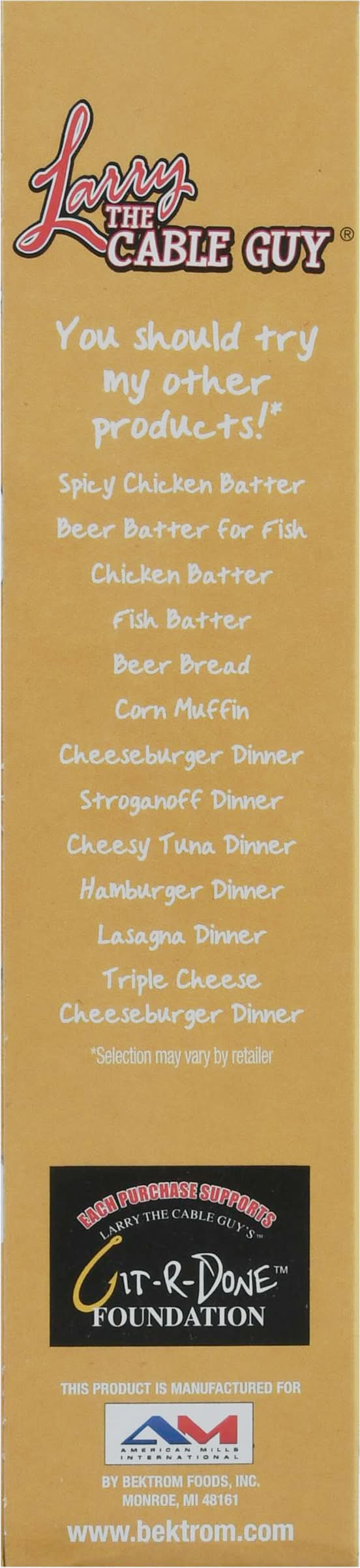 Made in a peanut & tree nut free facility. You gotta try it! Just add water. www.bektrom.com. Each purchase supports, Larry the Cable Guy's Git-R-Done Foundation. You should try my other products! (Selection may vary by retailer). Spicy Chicken Batter; Beer Batter for Fish; Chicken Batter; Fish Batter; Beer Bread; Corn Muffin; Cheeseburger Dinner; Stroganoff Dinner; Cheesy Tuna Dinner; Hamburger Dinner; Lasagna Dinner; Triple Cheese; Cheeseburger Dinner. Bektrom Foods, Monroe,MI,48161