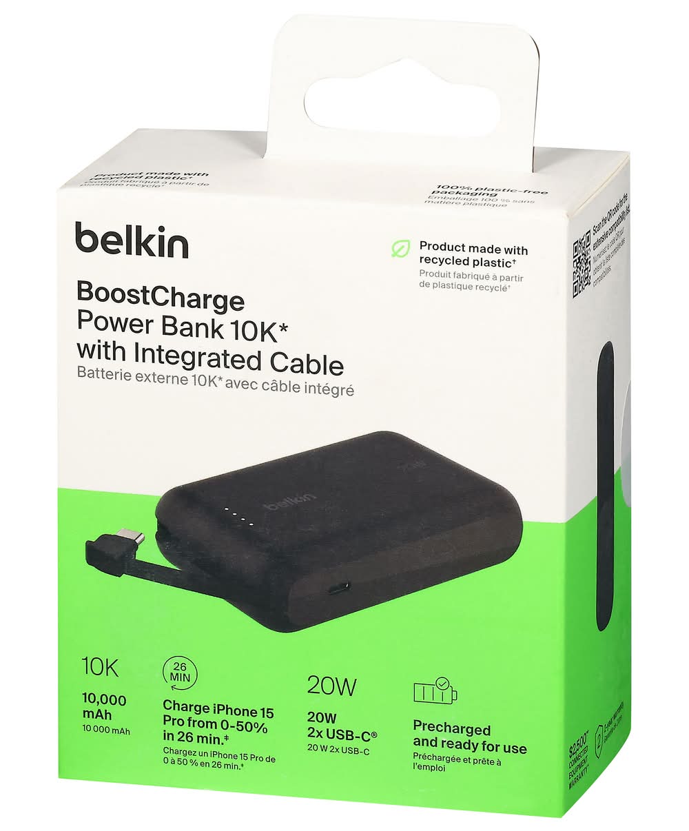 Belkin Boost Charge Power Bank 10k With Integrated Cable, Black
