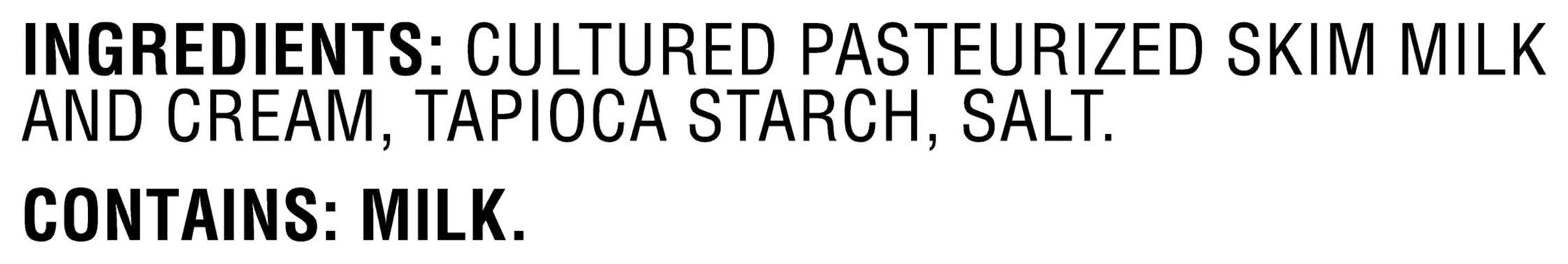 Ingredients: Cultured Pasteurized Skim Milk And Cream, Tapioca Starch, Salt Contains: Milk
