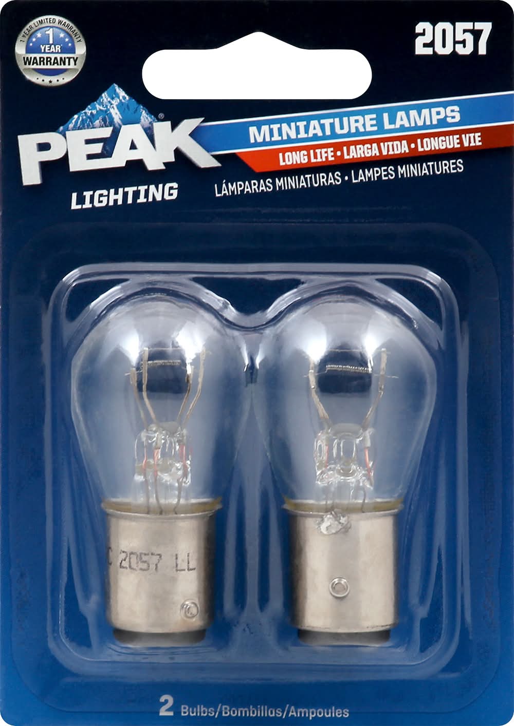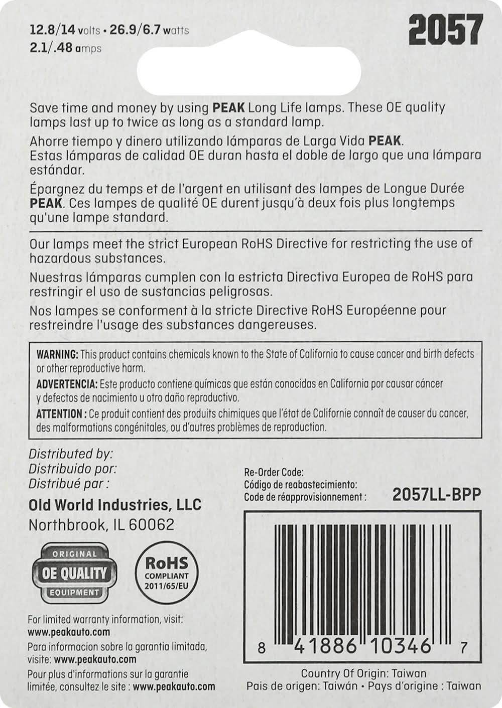 Lighting. Long life. 12.8/14 Volts. 26.9/6.7 Watts. 2.1/0.48 amps. Save time and money by using Peak long life lamps. These OE quality lamps last up to twice as long as a standard lamp. Our lamps meet the strict European RoHS directive for restricting the use of hazardous substances. Original OE quality equipment. 1 year limited warranty. For limited warranty information, visit: www.peakauto.com. www.peakauto.com. RoHS Compliant. Country of Origin: Taiwan. Old World Industries,