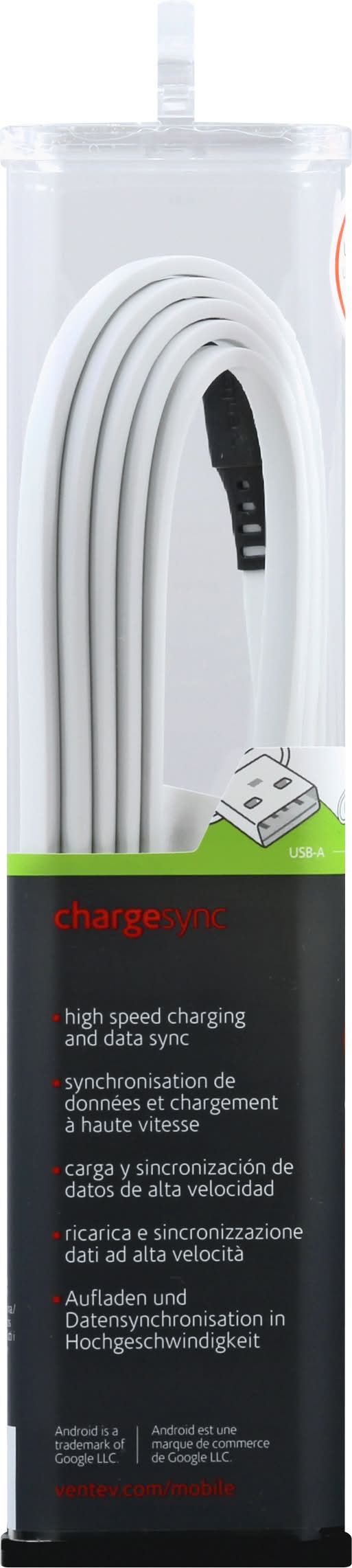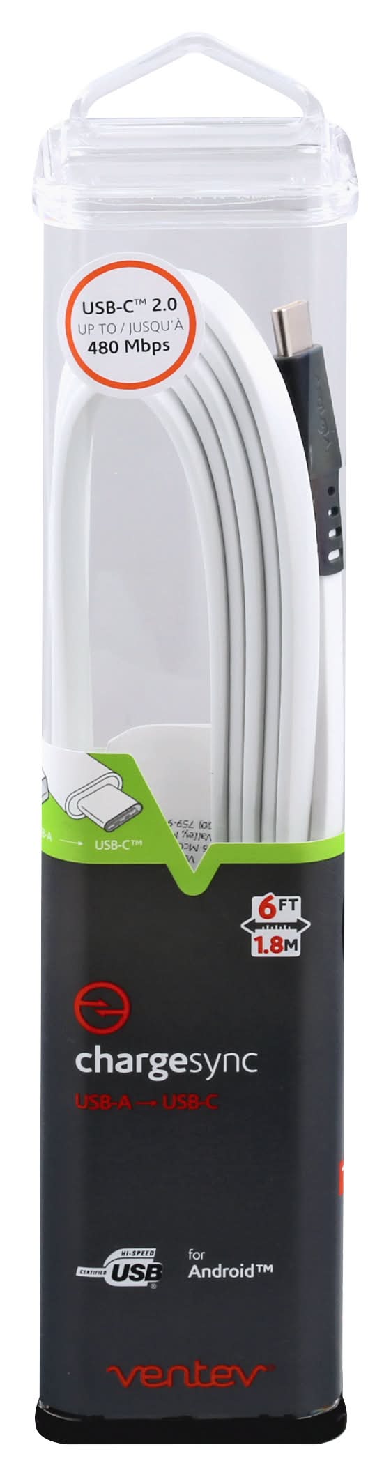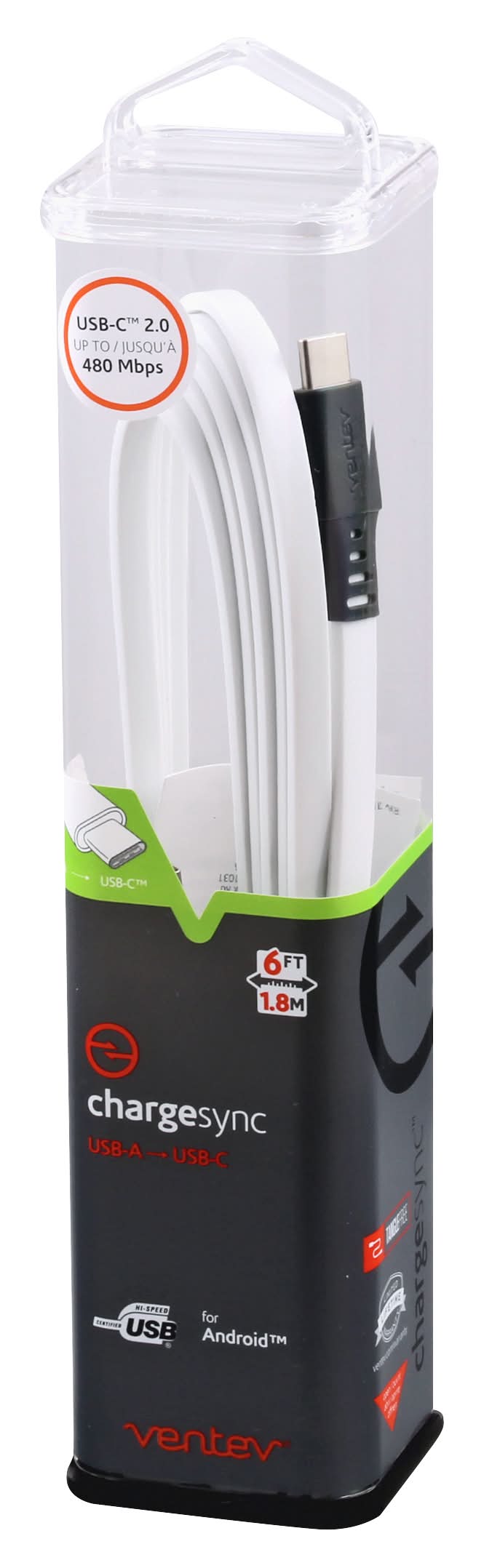 1.8 m. USB-C 2.0 up to 480 Mbps. Certified hi-speed USB. For android. High speed charging and data sync. Tangle free. 3A. Limited lifetime warranty. ventev.com/warranty. RoHS. ventev.com/mobile. Made in China. • Ventev, • Packaging: Reusable