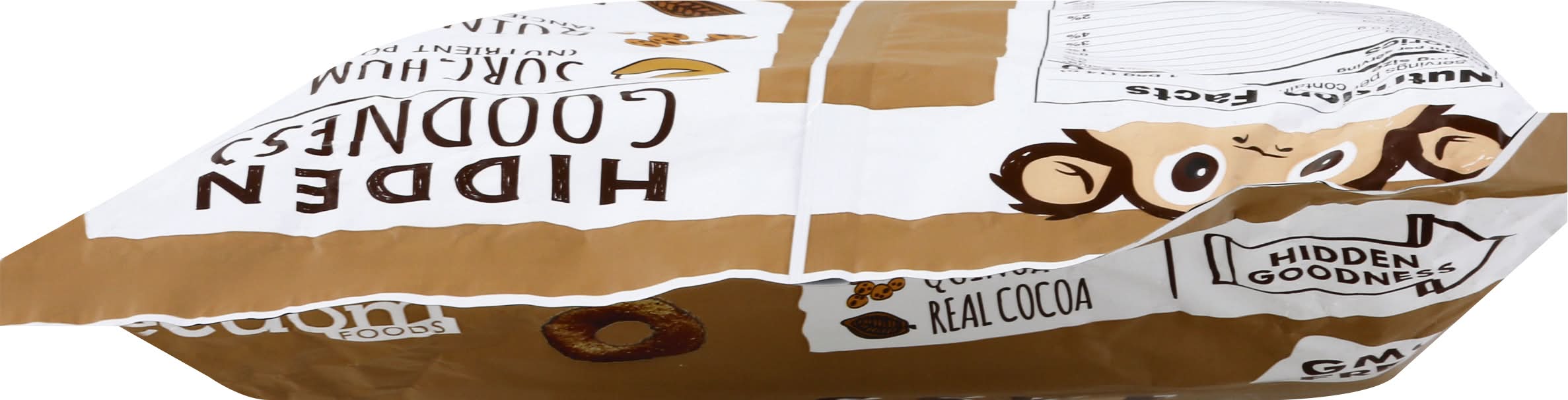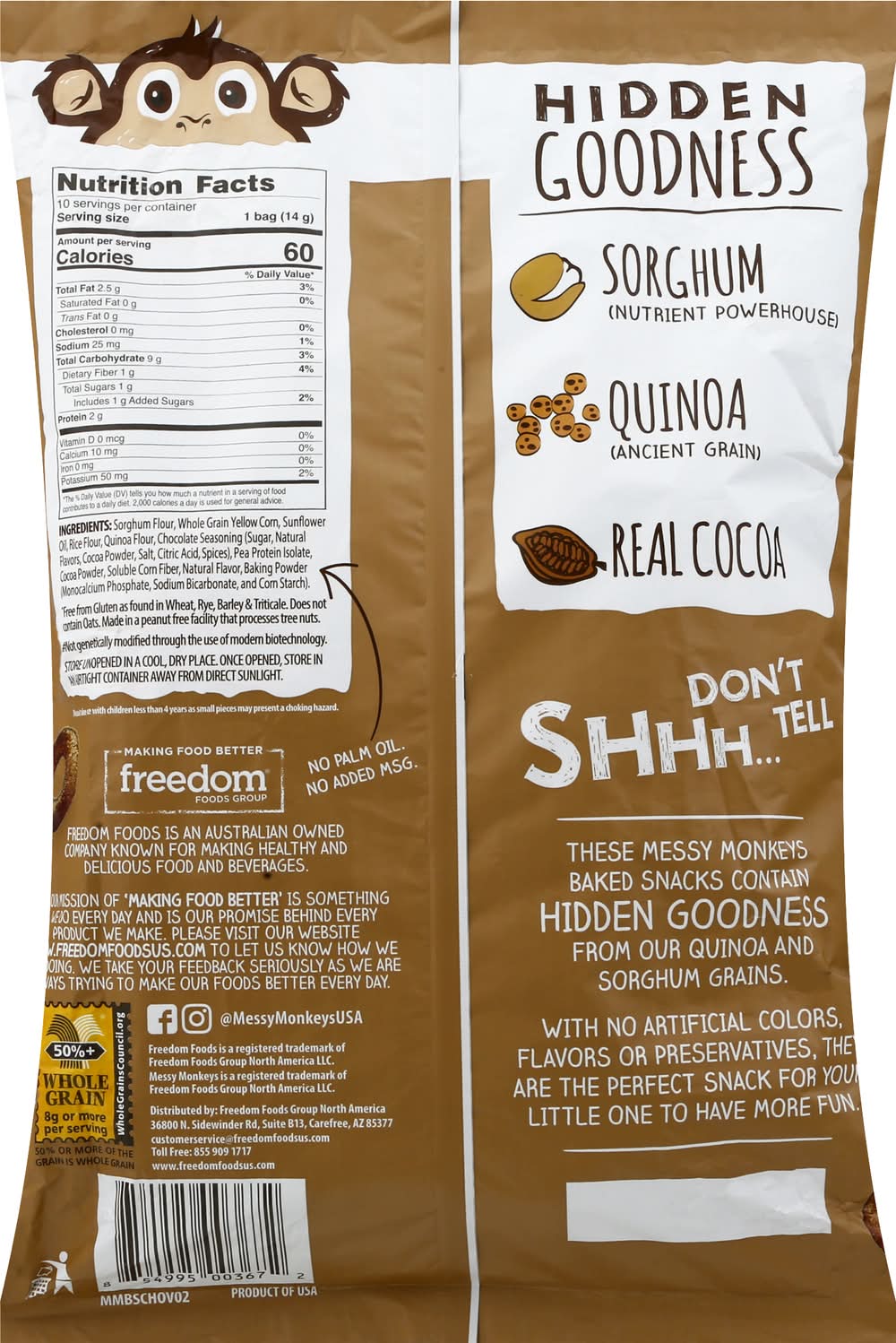 Gluten & peanut free (Free from gluten as found wheat, rye, barley & triticale. Does not contain oats. Made in a peanut free facility that processes tree nuts). 50%+ Whole Grain: 8 g or more per serving. 50% or more of the grain is whole grain. WholeGrainsCouncil.org. GMO free (Not genetically modified through the use of modern biotechnology). Sorghum. Quinoa. Real cocoa. Hidden goodness. Sorghum (Nutrient powerhouse). Quinoa (Ancient grain). No palm oil. No added MSG. Freedom foods is an Australian owned company known for making healthy and delicious food and beverages. Our mission of making food better is something we do every day and is our promise behind every product we make. Please visit our website www.freedomfoodsus.com to let us know how we are doing. We take your feedback seriously as we are always trying to make our foods better every day. Shhh don't tell. These messy monkeys baked snacks contain hidden goodness from our quinoa and sorghum grains. With no artificial colors flavors or preservatives, they are the perfect snack for your little one to have more fun. www.freedomfoodsus.com. Facebook. Instagram. (at)MessyMonkeyUSA. Please visit our website www.freedomfoodsus.com to let us know how we are doing. We take your feedback seriously as we are always trying to make our foods better every day. Toll Free: 855-909-1717. Dispose of properly. Product of USA. FREEDOM FOODS NORTH AMERICA,