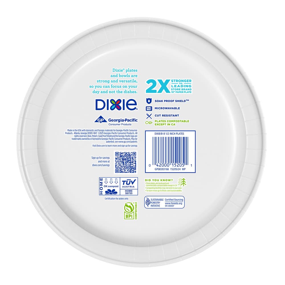 2x stronger vs. leading store brand 10 inches paper plate. Soak proof shield. Microwaveable. Cut resistant. Dixie plates and bowls are strong and versatile, so you can focus on your day and not the dishes. Make it right. Plates are made with 90% renewable plant-based materials. One tree is regrown for very tree used. • Color: Assorted • Size: 8.5 in