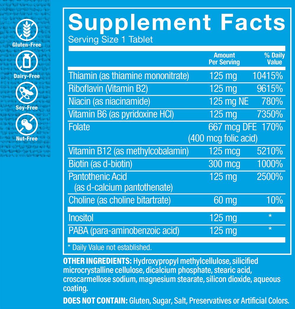 Supports energy production, stress, and nutrient metabolismSuitable for everyday wellness seekersFree of gluten, dairy, soy, nuts, sugar, salt, preservatives, and artificial colors When you're working hard to meet your health and wellness goals, you don't have time to feel lethargic, weak, or stressed. Adding The Vitamin Shoppe® brand Vitamin B-Complex 125 tablets to your daily routine can help you feel energized and ready for whatever the day has in store. These once-daily tablets contain seven essential B vitamins to help support the conversion of food into energy and a healthy stress response.