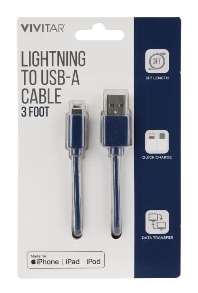 Charge your devices easily with this Vivitar Lightning to USB-A Cable. This lightning cable is suitable for quick charging and data transfer. Offers quick charge capabilities. Enables data transfer. Links your compatible iPhone®, iPad® or iPod® to a USB-A port or a USB-A power adapter. Color: Blue