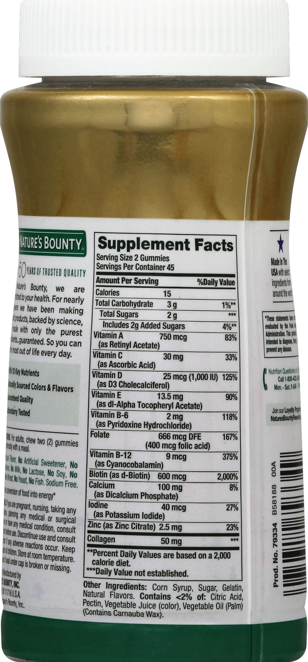 Ingredients: Vitamin A 750 mcg(as Retinyl Acetate), Vitamin C 30 mg (as Ascorbic Acid), Vitamin D 25 mcg (1,000 IU) (as D3 Cholecalciferol), Vitamin E 13.5 mg (as dl-Alpha Tocopheryl Acetate), Vitamin B-6 2 mg (as Pyridoxine Hydrochloride), Vitamin B-12 9 mcg (as Cyanocobalamin), Biotin (as d-Biotin) 600 mcg, Calcium 100 mg (as Dicalcium Phosphate), Iodine 40 mcg (as Potassium Iodide), Zinc (as Zinc Citrate) 2.5 mg, Collagen 50 mg **, Folate 666 mcg DFE (400 mcg folic acid)