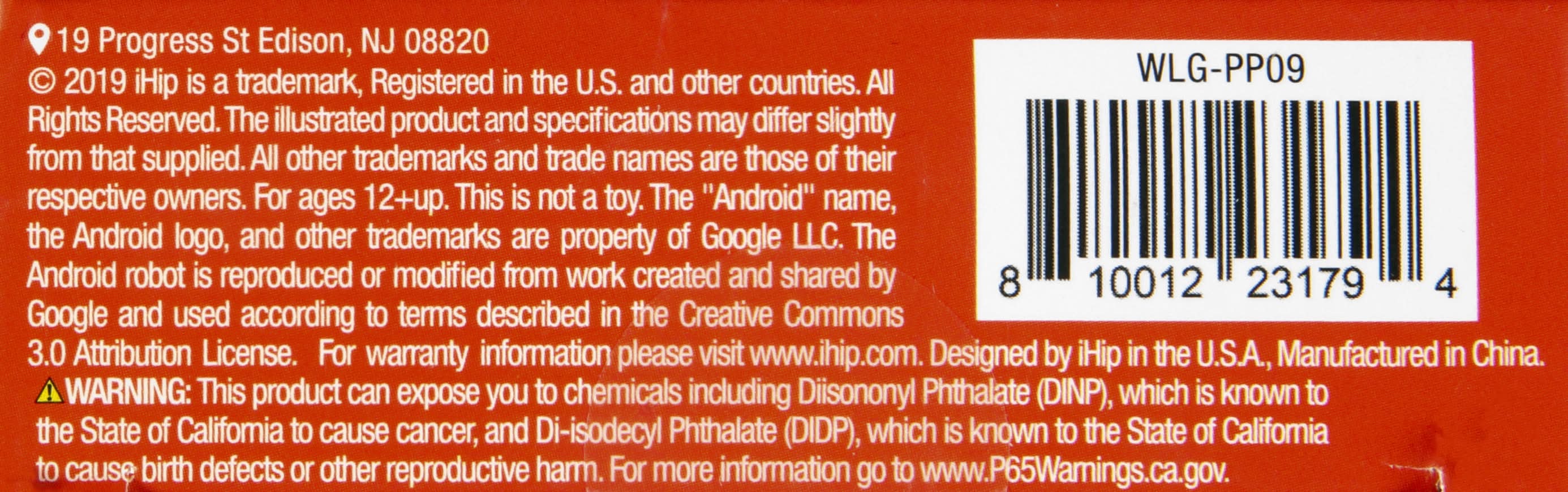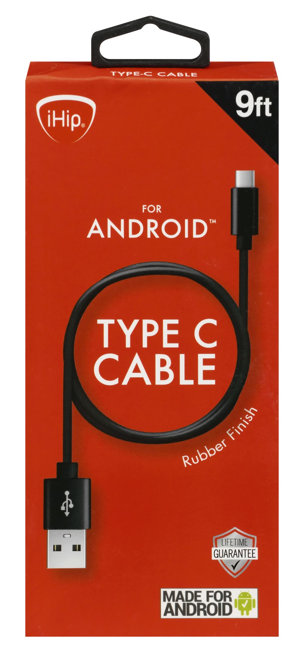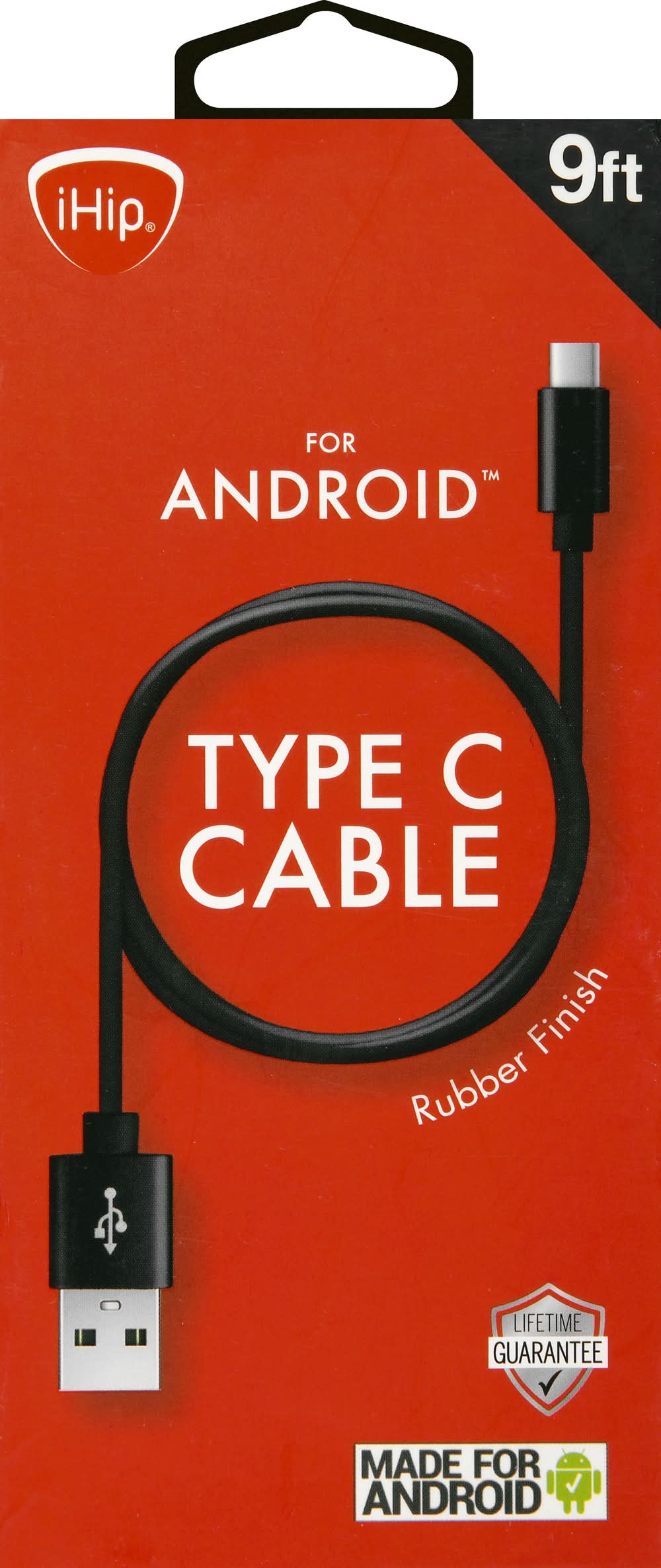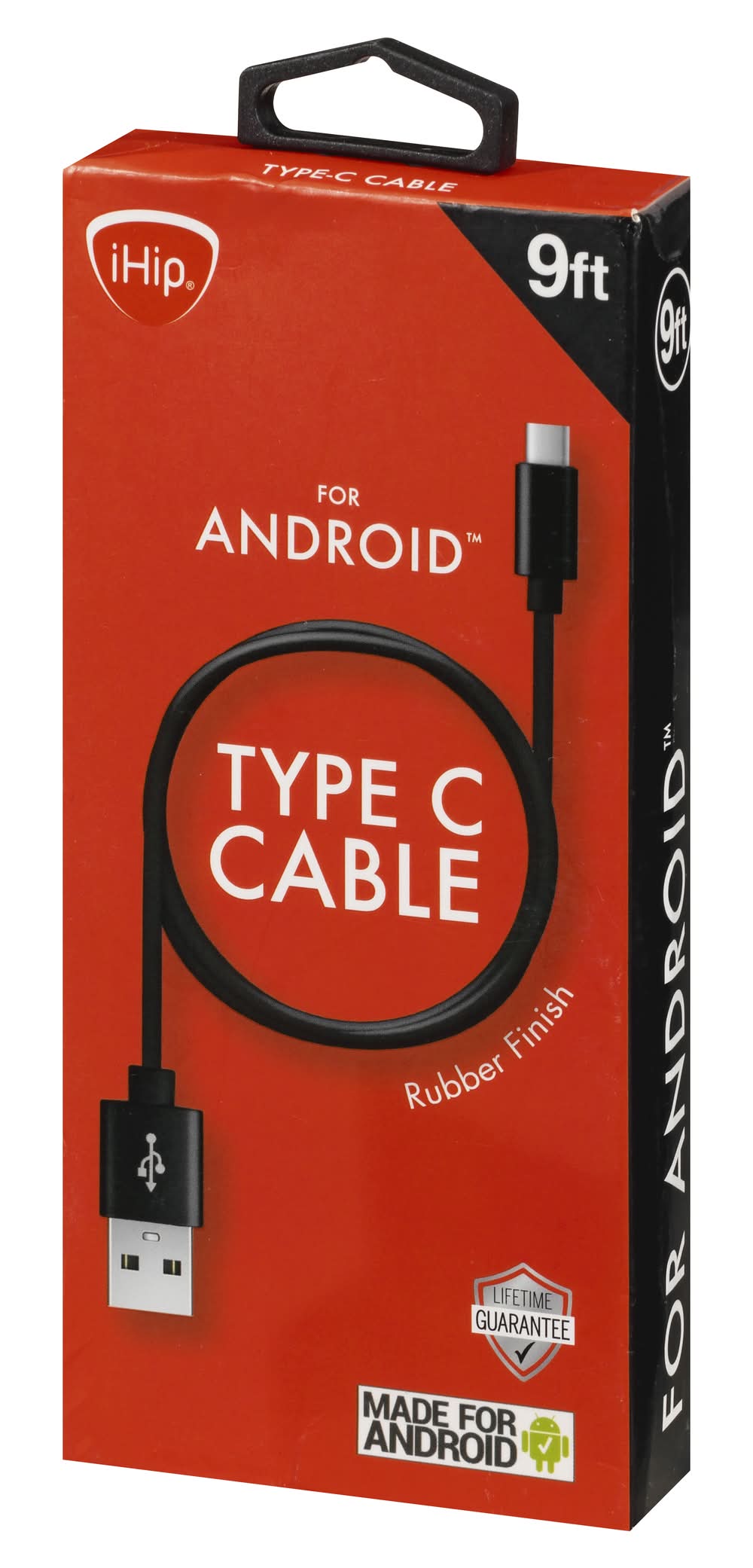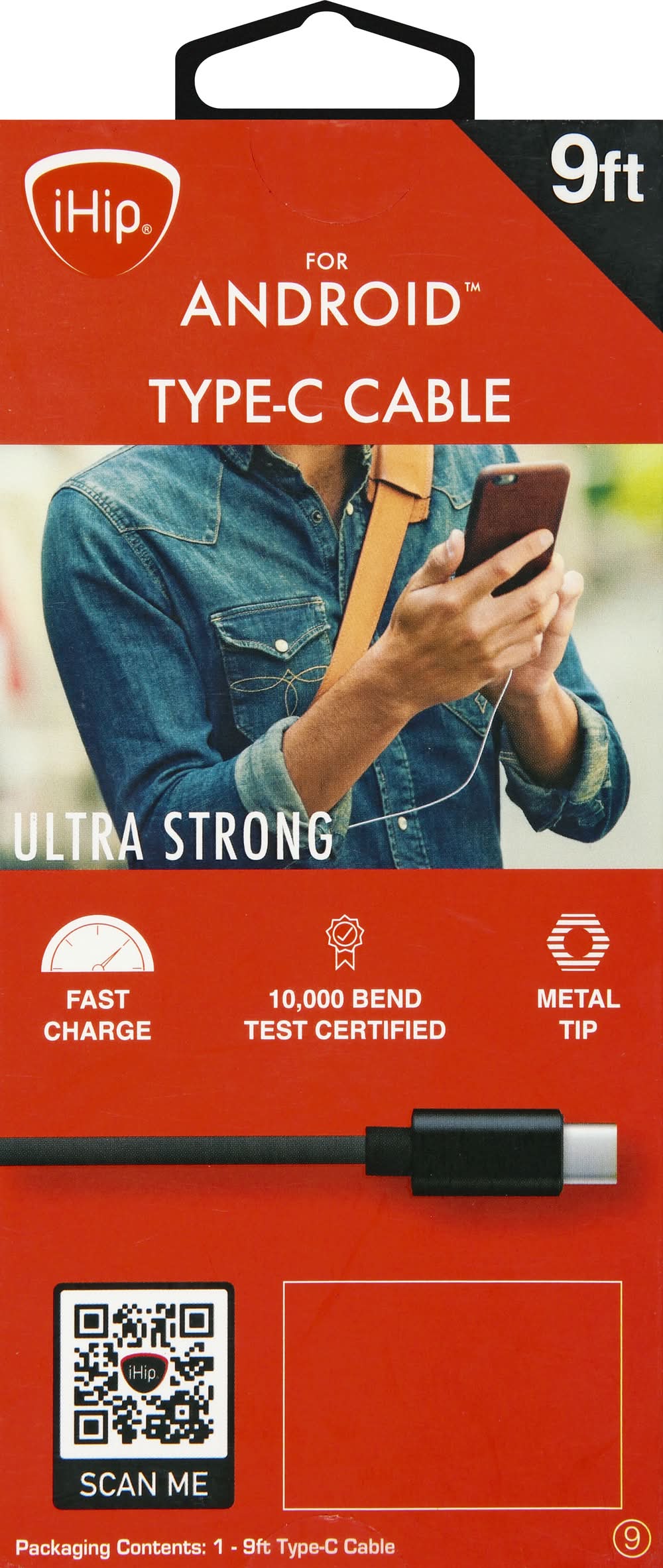 For ages 12+ up. Packaging Contents: 1 - 9ft Type-C cable. Rubber finish. Made for Android. Ultra strong. Fast charge. 10,000 bend test certified. Metal tip. Lifetime guarantee. For warranty information please visit www.ihip.com. www.ihip.com. Scan me. Designed by iHip in the USA. Manufactured in China. Ihip,