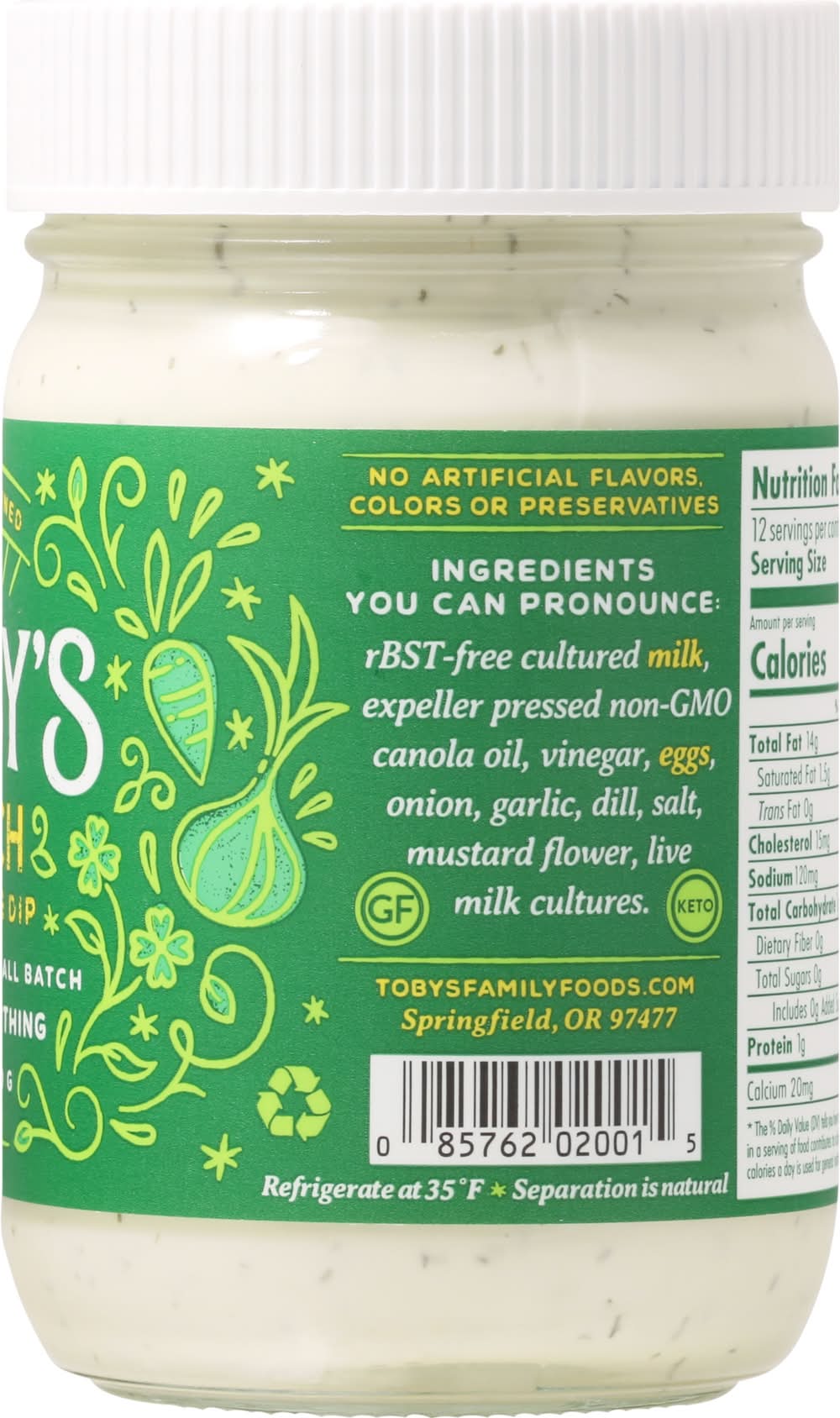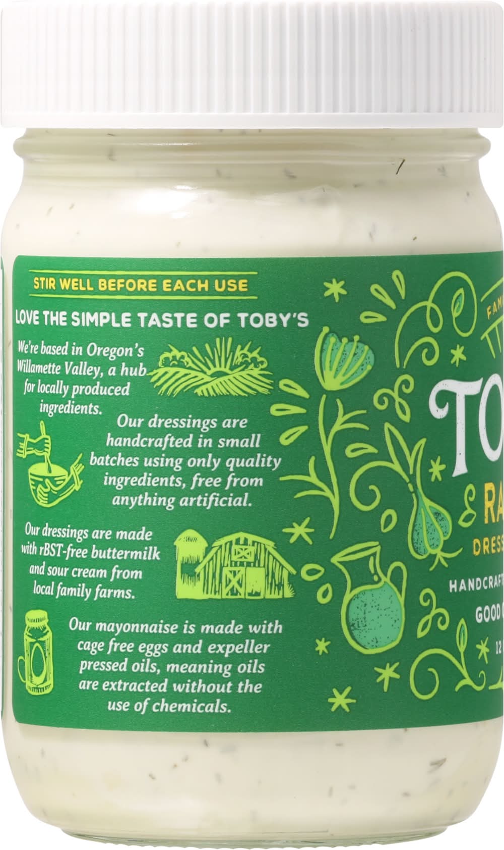 No artificial flavors, colors or preservatives. Gluten free. Keto. Handcrafted. Small batch. Good on anything. Love the simple taste of Toby's. We're based in Oregon's Willamette Valley, a hub for locally produced ingredients. Our dressing are handcrafted in small batches using only quality ingredients, free from anything artificial. Our dressings are made with rBST-free buttermilk and sour cream from local family farms. Our mayonnaise is made with cage free eggs and expeller pressed oils, meaning oils are extracted without the use of chemicals. Separation is natural. tobysfamilyfoods.com. Family owned. • Tobys Family Foods, • Packaging: Reusable