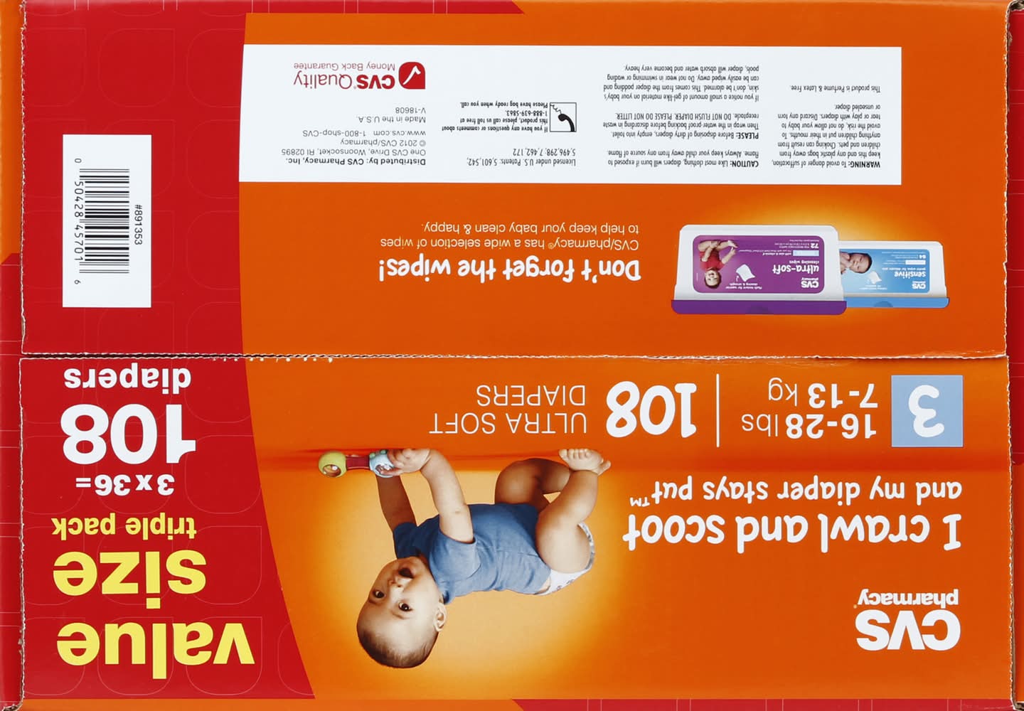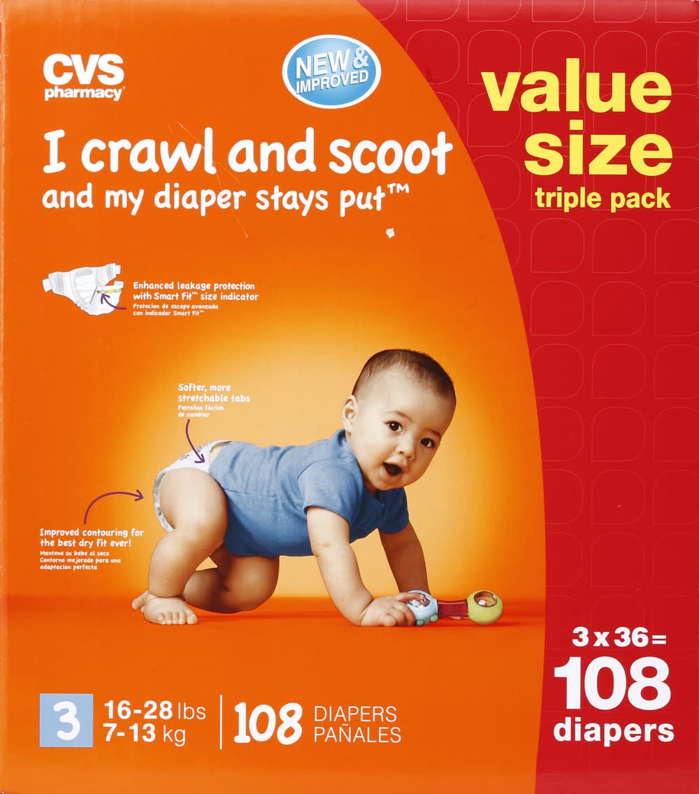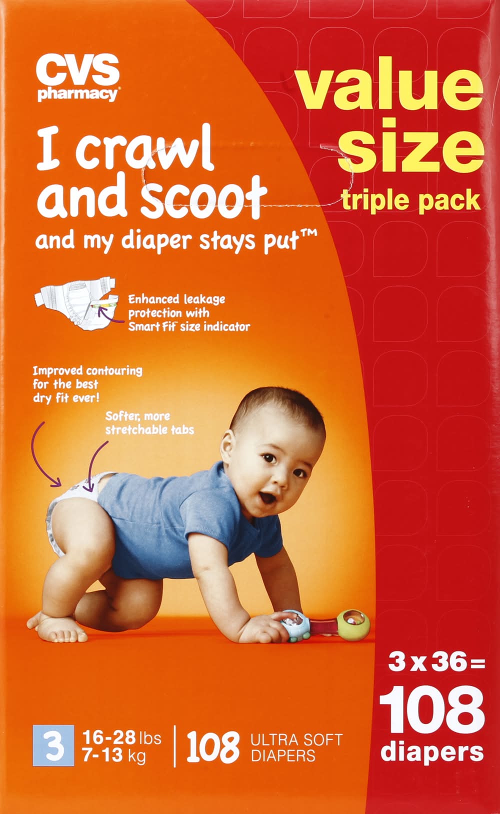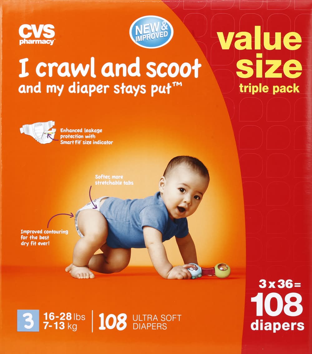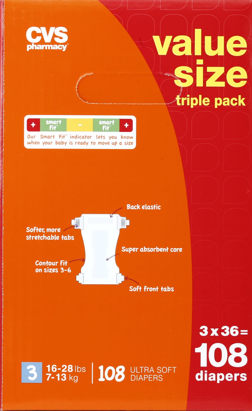 Triple pack. 3 x 36 = 108 diapers. Improved. Enhanced leakage protection with Smart Fit size indicator. Softer, more stretchable tabs. Improved contouring for the best dry fit ever! I crawl and scoot and my diaper stays put. Our Smart Fit indicator lets you know when your baby is ready to move up a size. Don't forget the wipes! CVS/pharmacy has a wide selection of wipes to help keep your baby clean & happy. Back elastic. Softer, more stretchable tabs. Super absorbent core. Contour fit on sizes 3-6. Soft front tabs. This product is perfume & latex free. CVS quality. Made in the USA. CVS,