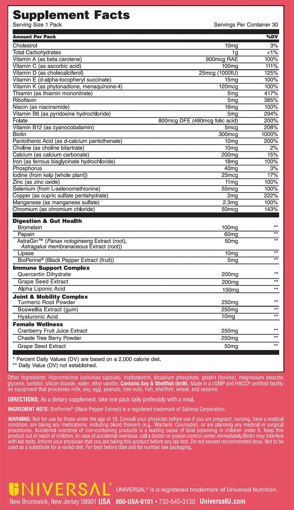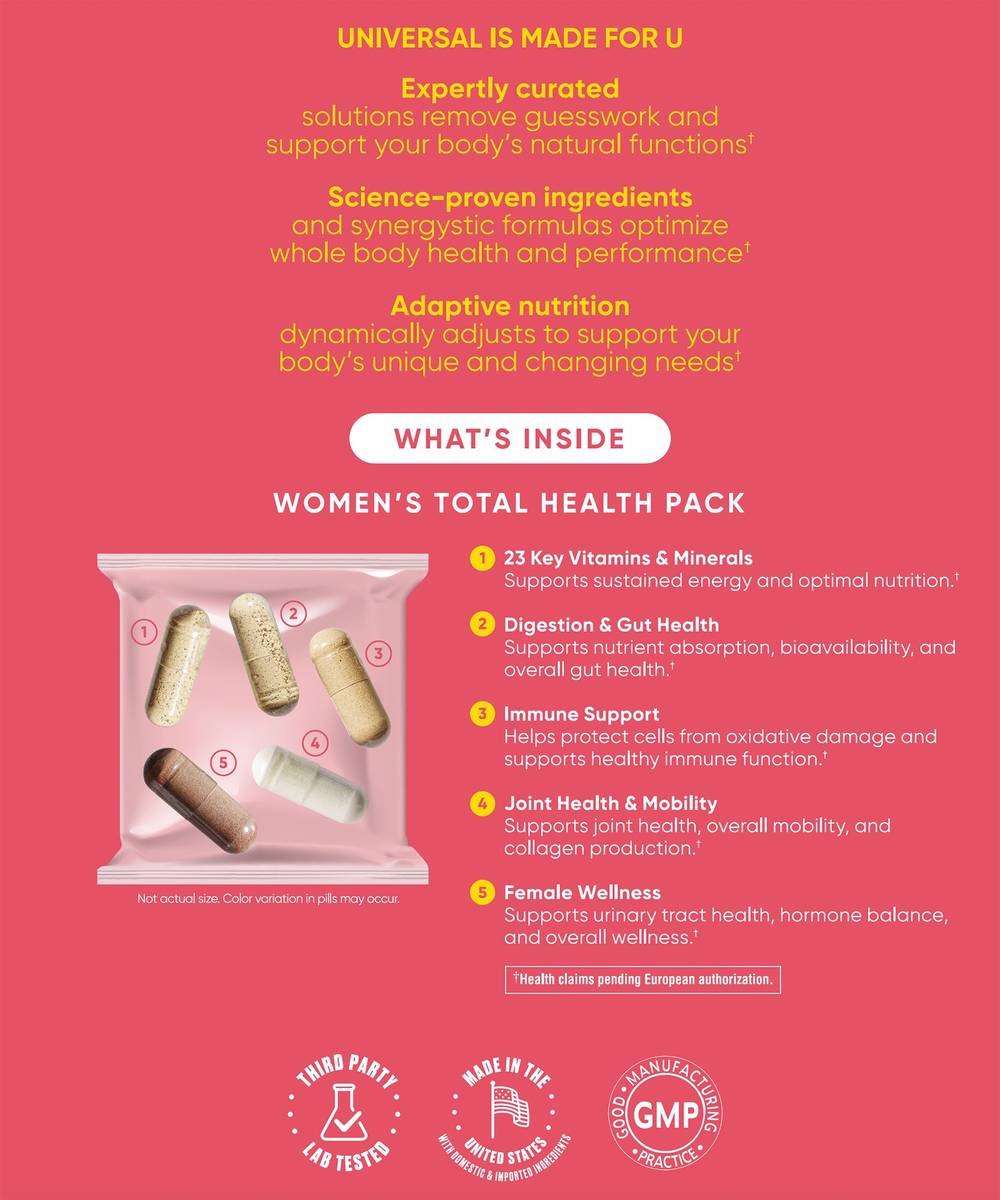 Universal is made for U. Expertly curated solutions remove guesswork and support your body's natural functions. Science-proven ingredients and synergystic formulas optimize whole body health and performance. Adaptive nutrition dynamically adjusts to support your body's unique and changing needs. What's inside: 1. 23 Key Vitamins & Minerals supports sustained energy and optimal nutrition. 2. Digestion & Gut Health supports nutrient absorption, bioavailability, and overall gut health. 3. Immune Support helps protect cells from oxidative damage and supports healthy immune function. 4. Joint Heatlh & Mobility supports joint health, overall mobility, and collagen production. 5. Female wellness supports urinary tract health, hormone balance, and overall wellness.