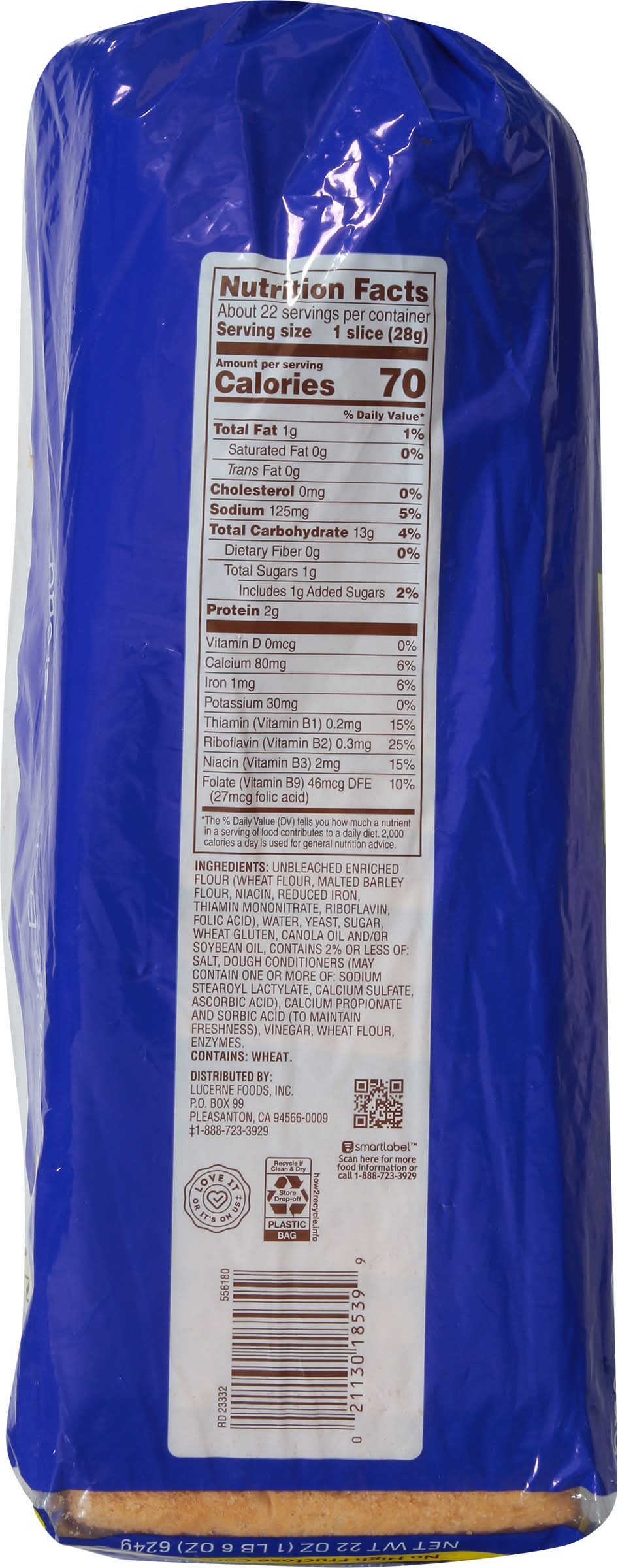 Unbleached Enriched Flour (Wheat Flour Malted Barley Flour Niacin Reduced Iron Thiamin Mononitrate Riboflavin Folic Acid), Water, Yeast, Sugar, Wheat Gluten, Canola Oil and/or Soybean Oil, Contains 2% or Less of: Salt, Dough Conditioners (May Contain One or More of: Sodium Stearoyl Lactylate Calcium Sulfate Ascorbic Acid), Calcium Propionate and Sorbic Acid (to Maintain Freshness), Vinegar, Wheat Flour, Enzymes Contains: Wheat, Barley, Gluten, Soybeans Additives: None