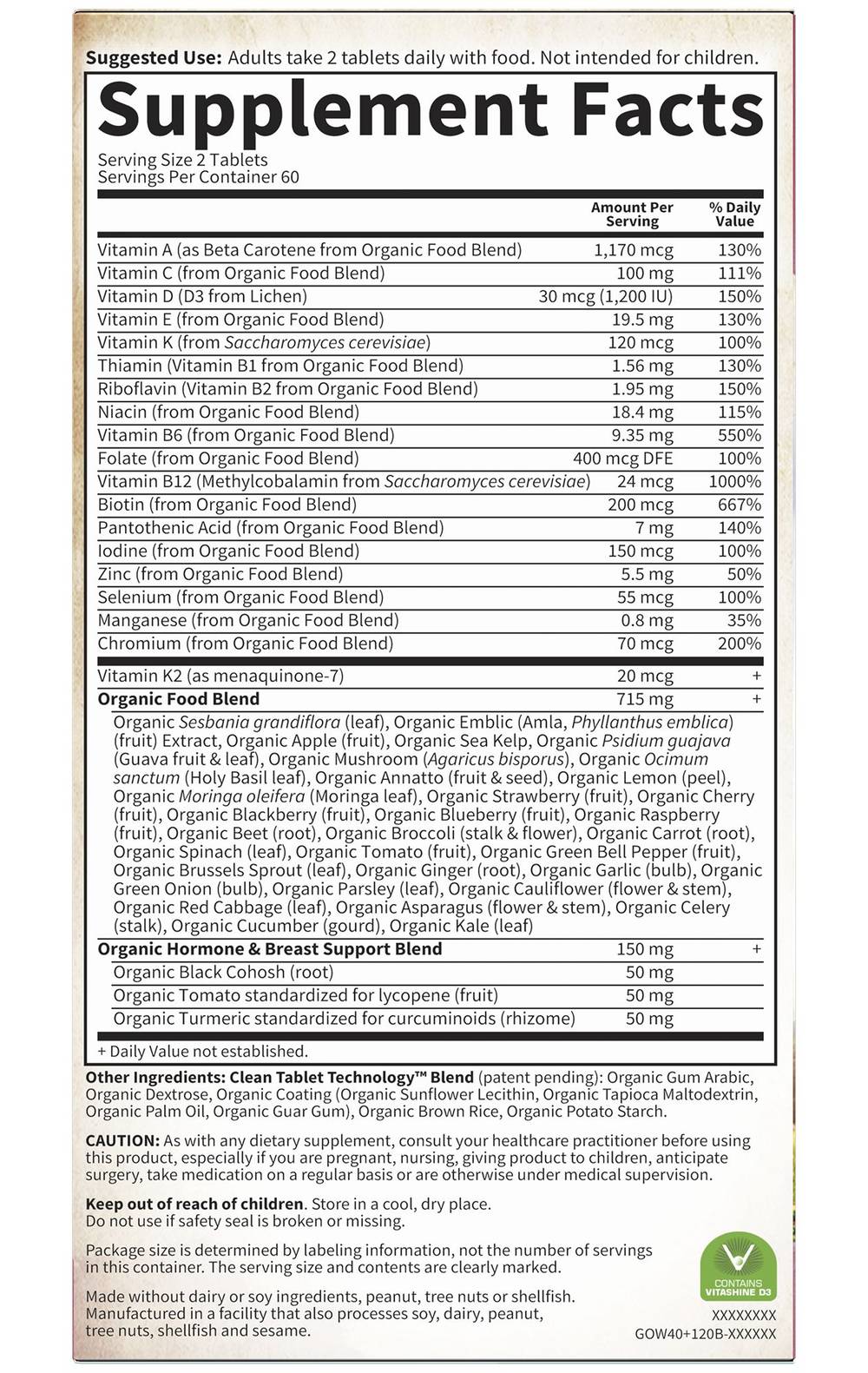 Supports womens overall health & wellbeing Certified USDA Organic & Non-GMO Project Verified Vegan Ensure your nutritional needs are met with Organics Womens Multi 40+. These vegan tablets are designed to promote overall wellness while supporting hormonal, breast, and cardiovascular health with targeted ingredients such as 30+ organic powdered fruits, vegetables, and herbs, plus vitamin D3 and B-12.
