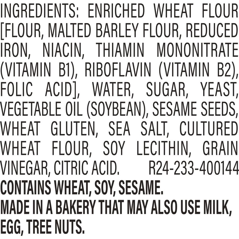 ENRICHED WHEAT FLOUR [FLOUR, MALTED BARLEY FLOUR, REDUCED IRON, NIACIN, THIAMIN MONONITRATE (VITAMIN B1), RIBOFLAVIN (VITAMIN B2), FOLIC ACID], WATER, SUGAR, YEAST, VEGETABLE OIL (SOYBEAN), SESAME SEEDS, WHEAT GLUTEN, SEA SALT, CULTURED WHEAT FLOUR, SOY LECITHIN, GRAIN VINEGAR, CITRIC ACID. Contains: CONTAINS SESAME, SOY, WHEAT.