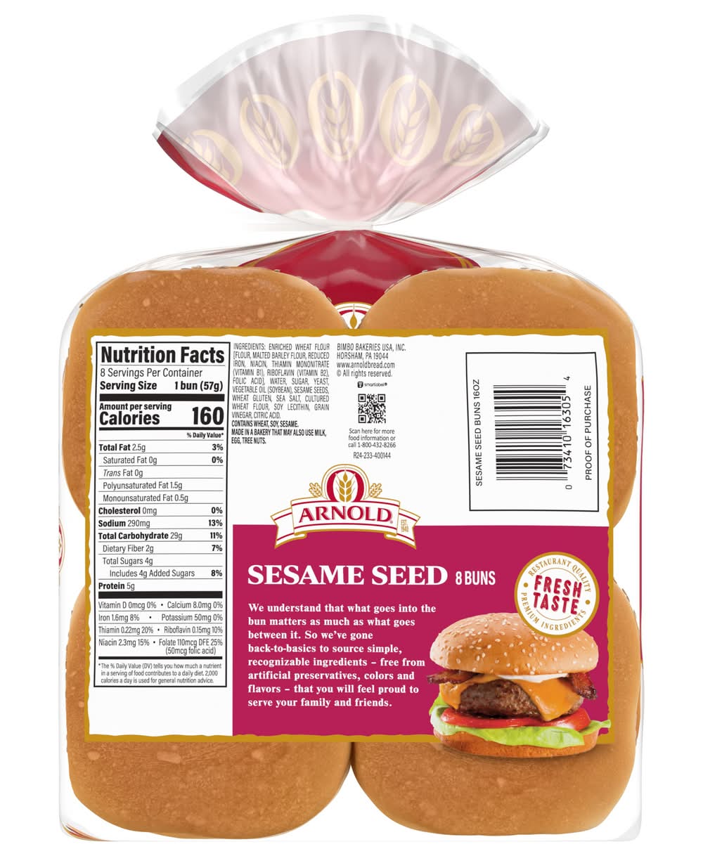 Arnold Sesame Seeded Sandwich Buns are baked with the finest ingredients, giving you the nutrition you need and the taste that you love. Bimbo Bakeries USA, Inc., Horsham, PA, 19044