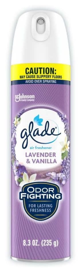 Glade Odor Fighting Lavender & Vanilla Air Freshener is infused with an enhanced level of fragrance, designed to provide long-lasting freshness. It features odor-fighting technology that works to neutralize and eliminate unpleasant smells, offering instant refreshment of your environment. The product utilizes a 100% natural propellant. It is packaged in a can that includes at least 10% post-consumer recycled material and is free from CFCs and other substances that could deplete the ozone layer. • S.C. Johnson & Son, Inc., • Packaging: Reusable